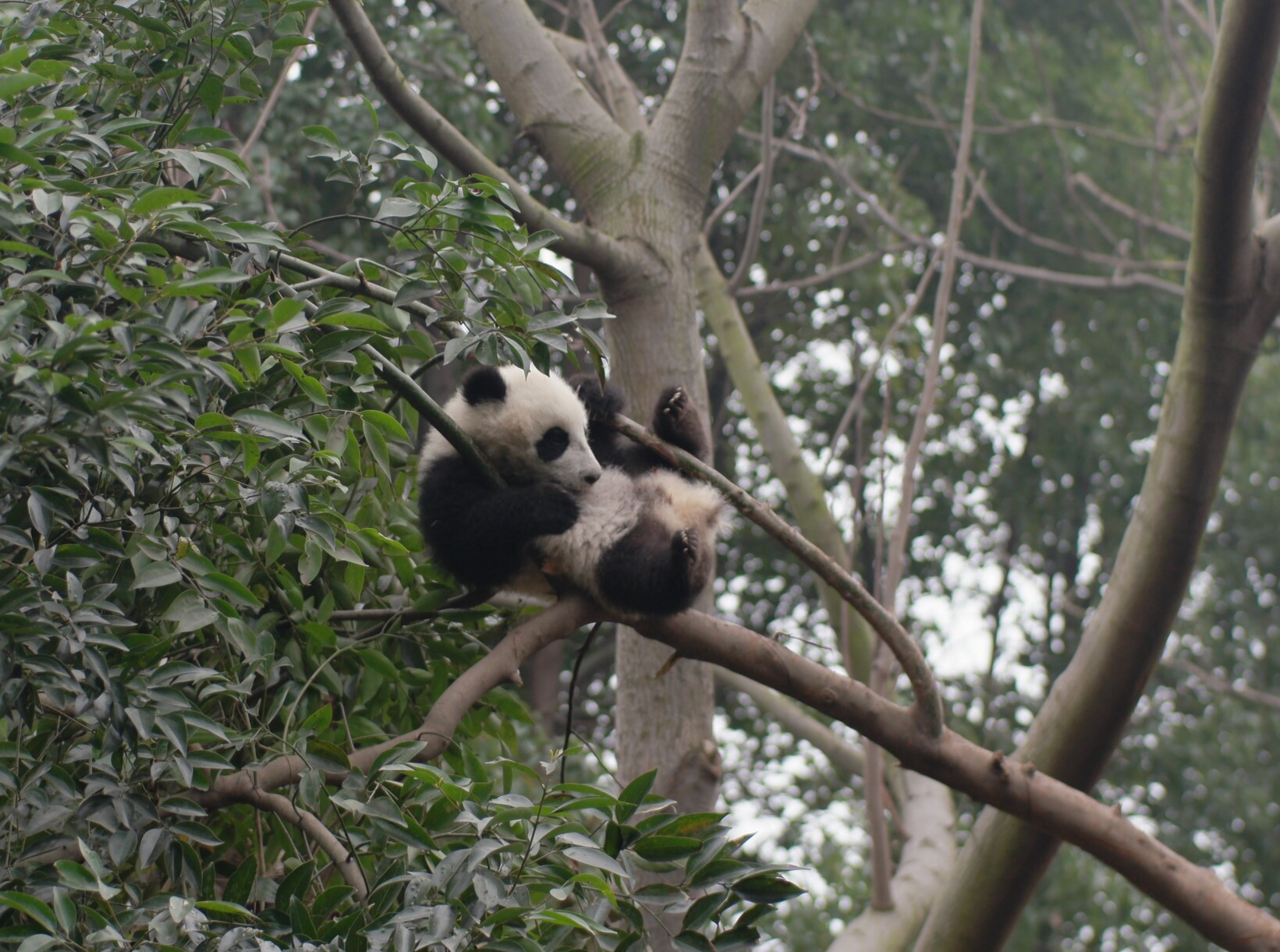 有別於香港海洋公園的熊貓,這兒的熊貓還會爬樹,這隻熊貓被自己的肥肚腩「卡」住在樹上,場面搞笑滑稽。