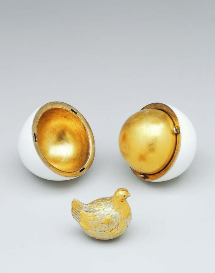 俄國史上首枚皇室復活彩蛋,白色蛋殼內藏一枚金雞蛋,金蛋裏再有小金雞、鑽石后冠等,驚喜重重。