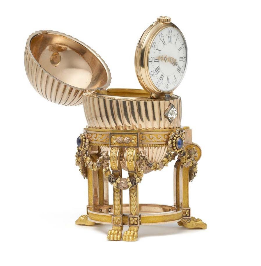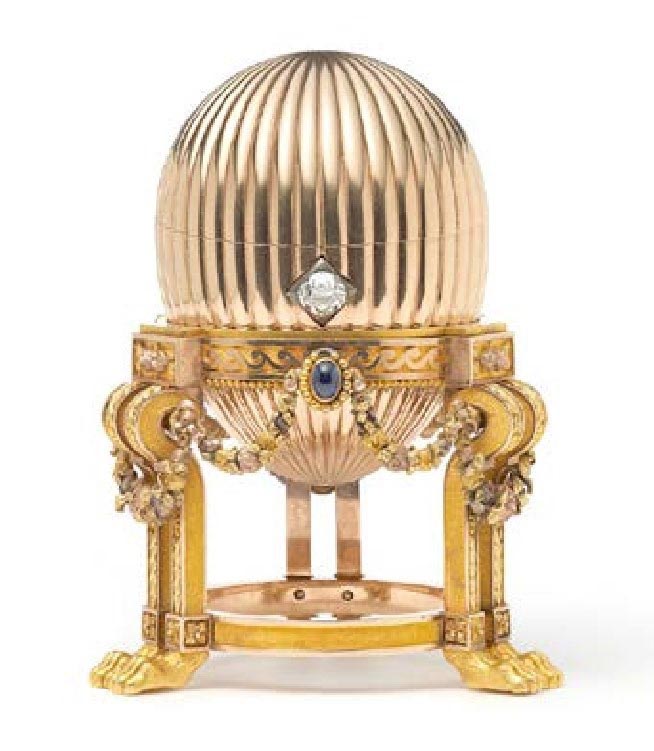 這枚彩蛋是亞歷山大三世在1887年送給妻子的復活節禮物。黃金製造的彩蛋,內裏鑲嵌一枚名貴懷表、藍寶石和玫瑰切割鑽石,極盡奢華。