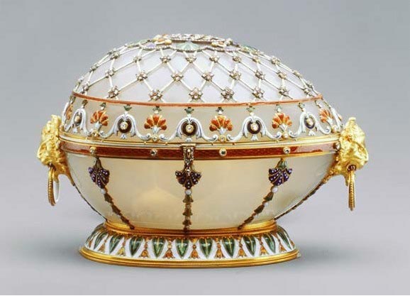 這是亞歷山大三世送給妻子的最後一枚彩蛋,主體是白色瑪瑙,配以黃金、琺瑯、鑽石、紅寶石作裝飾,彩蛋頂部有「1894」字樣,標示製作年份。