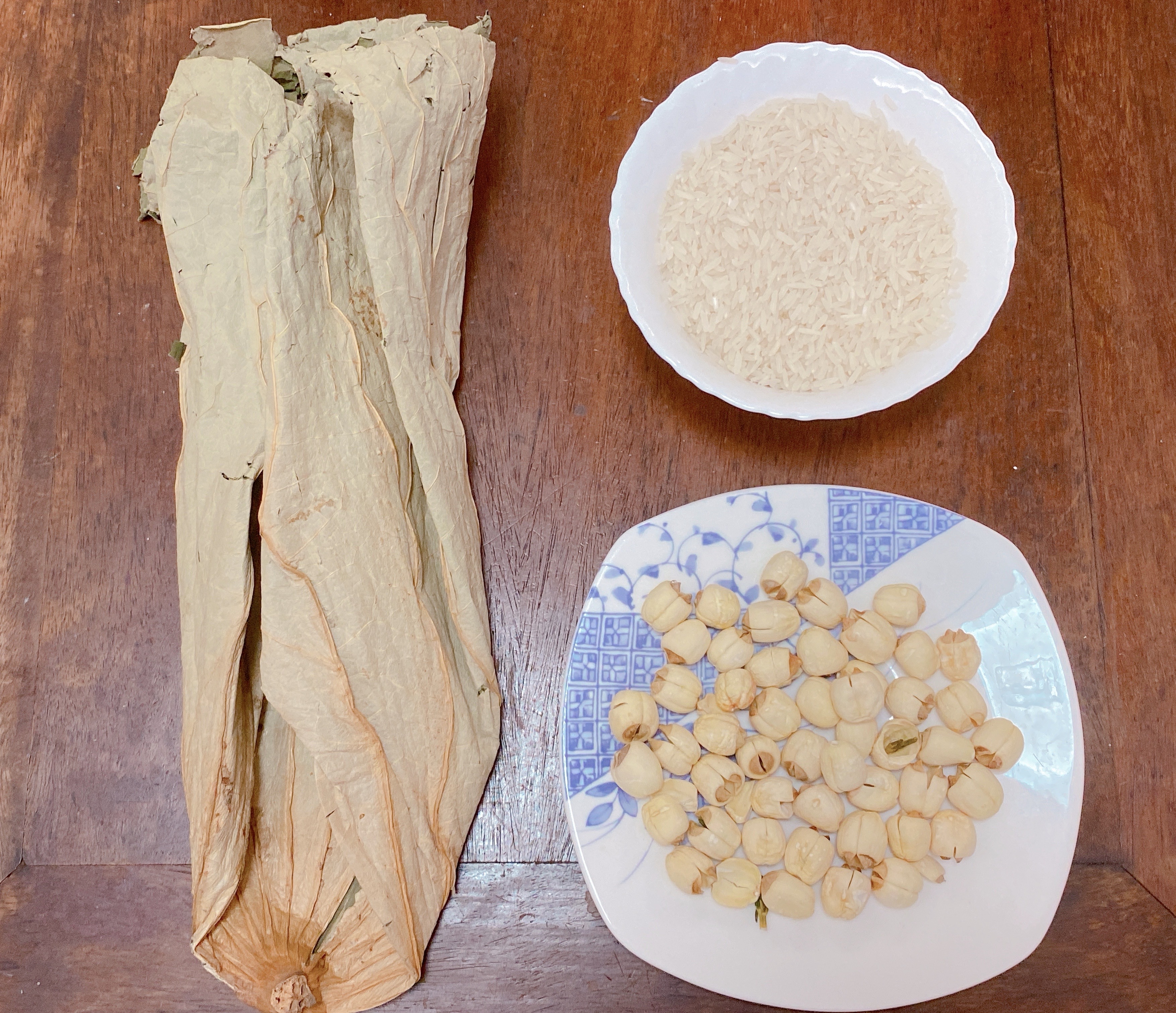 材料:鮮荷葉半片、蓮子5粒、粳米半碗。