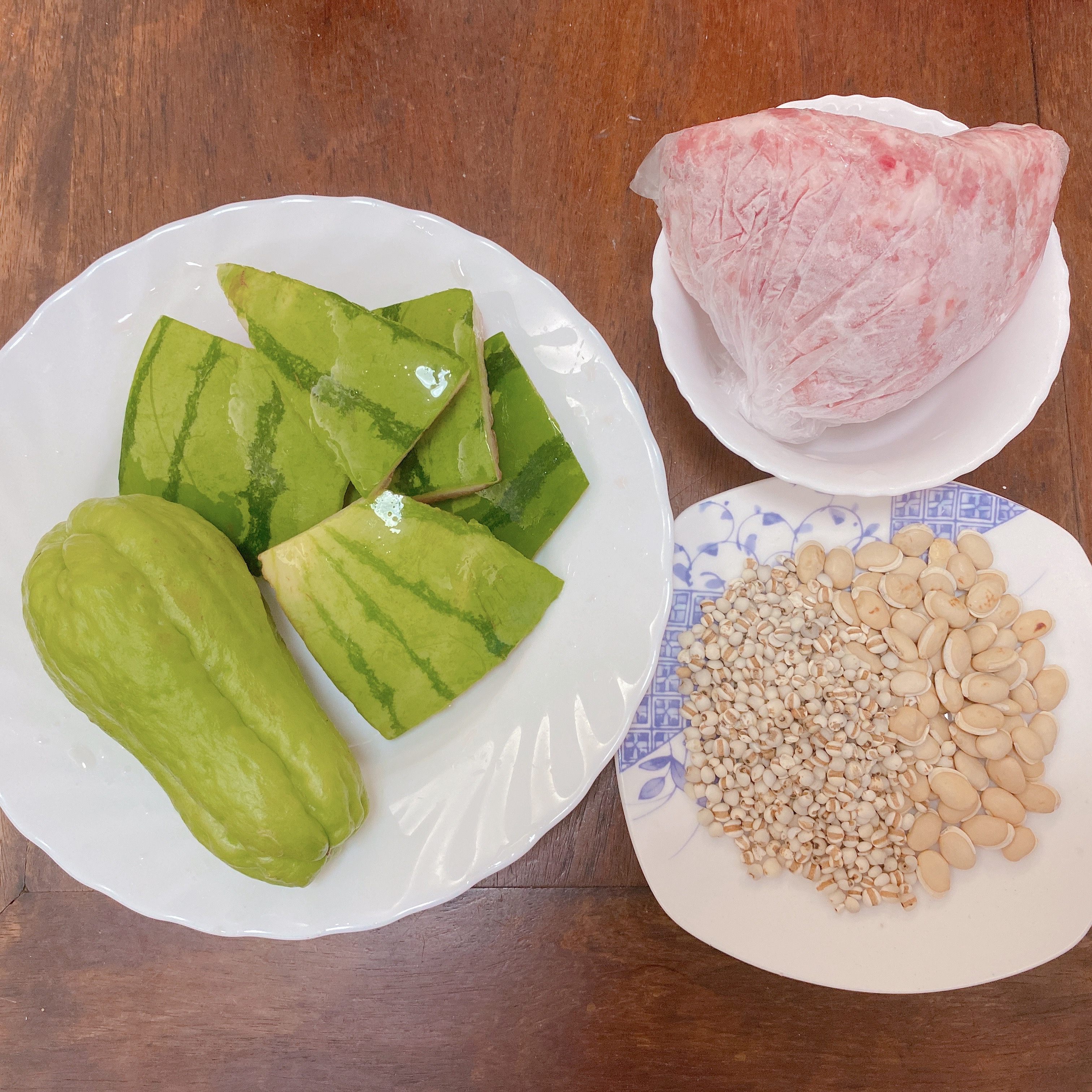 材料:手掌大西瓜皮 3件、生熟薏米各15克、白扁豆 10克、合掌瓜 2個、瘦肉 500克、水適量。