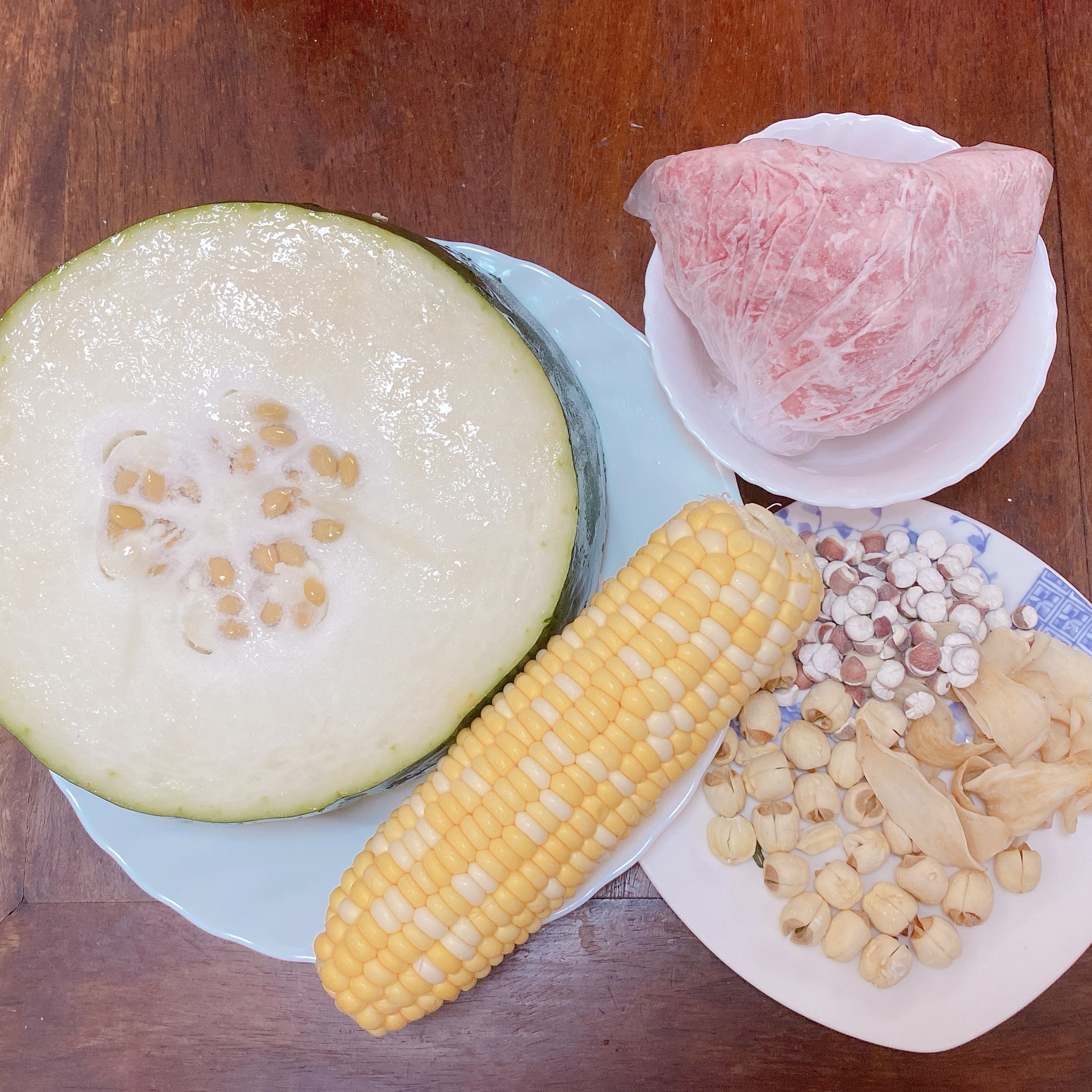 材料:冬瓜一斤、乾百合 10克、 蓮子10克、芡實10克、粟米1條、瘦肉 500克、水適量。
