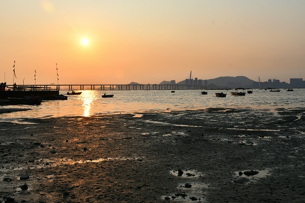 以對岸深圳為背景,深圳灣大橋作主角,在灘塗的襯托下,拍出滄海桑田的夕陽美景。