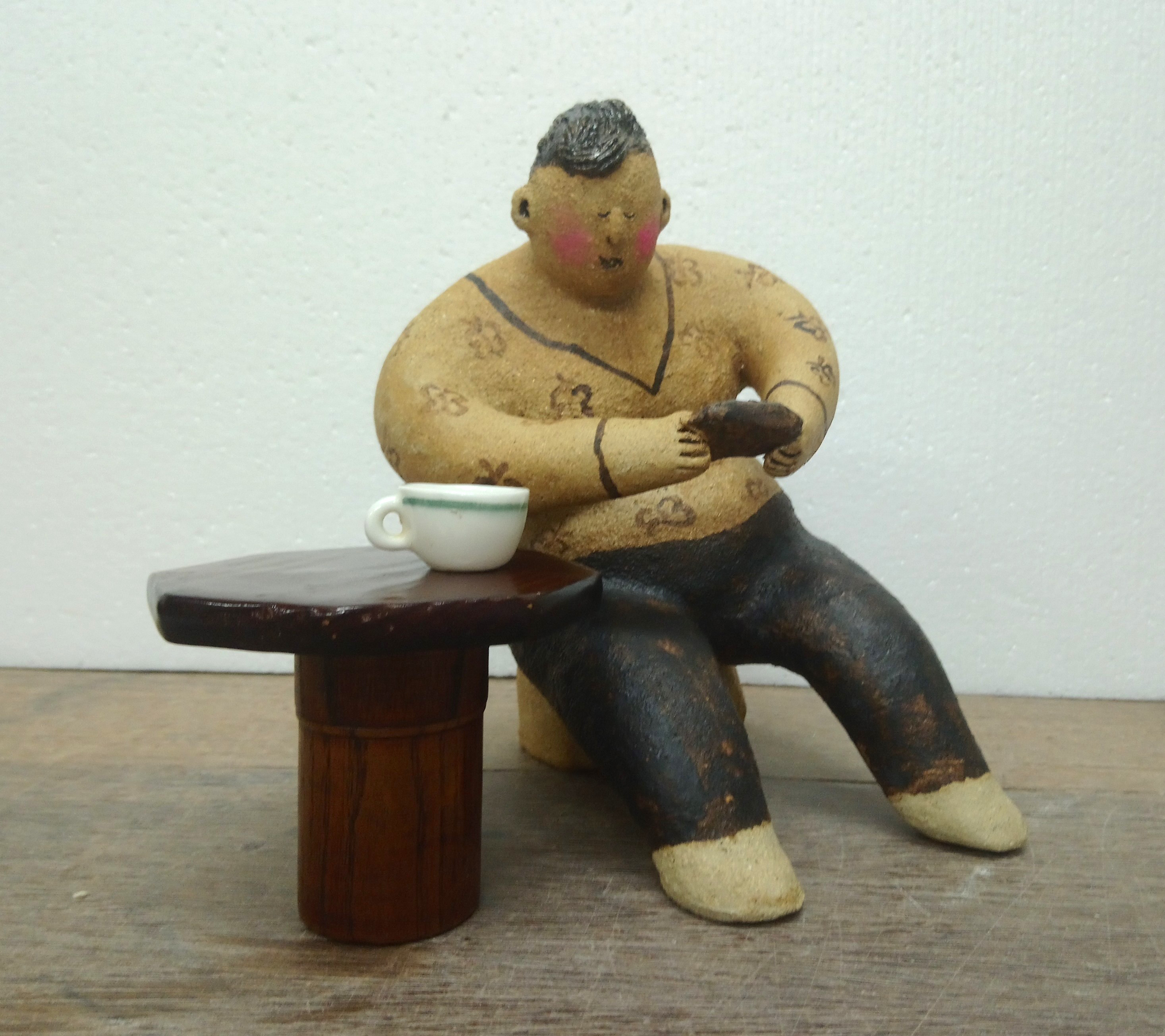 近年李慧嫻也有嘗試捏造較為苗條造型的陶塑,她2016年參加日本滋賀縣信樂的陶藝之森陶藝硏修室,做駐留藝術家,發現當地不同顏色、質感的陶泥,圖為用日本黑御影土製作的人物。