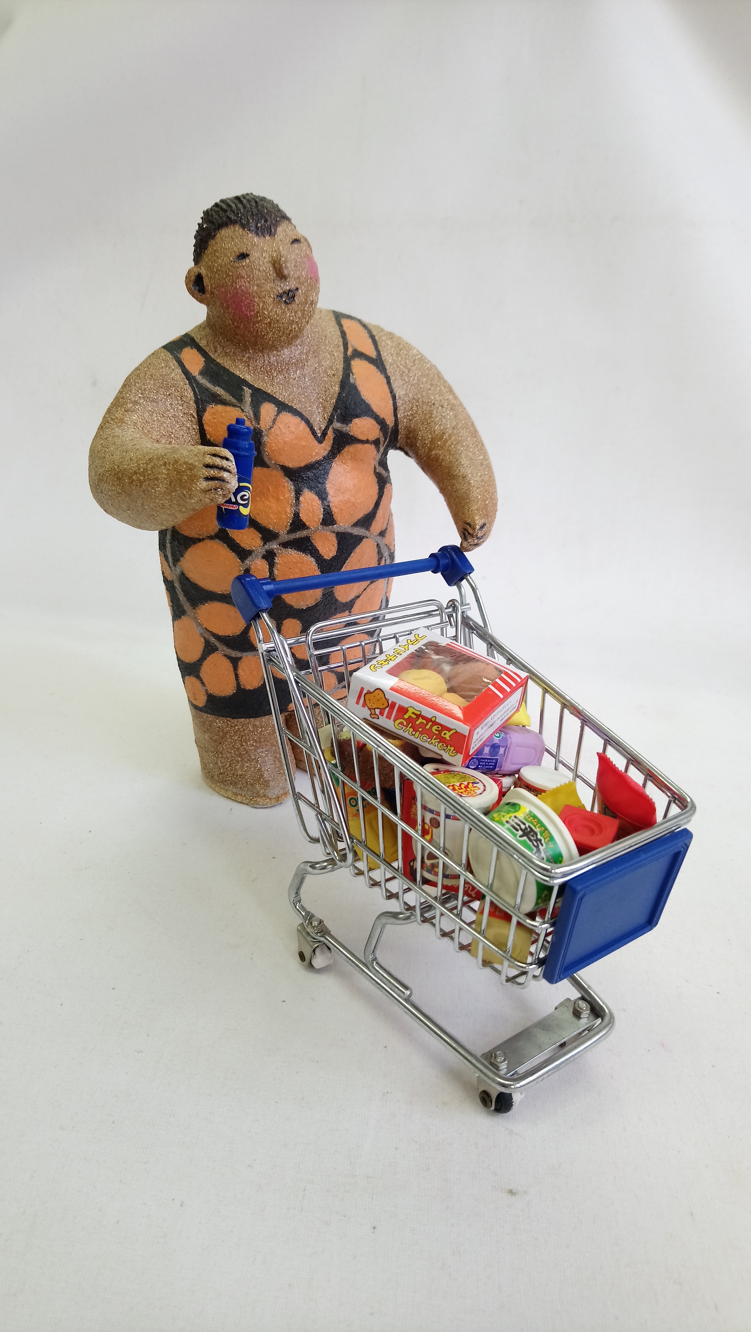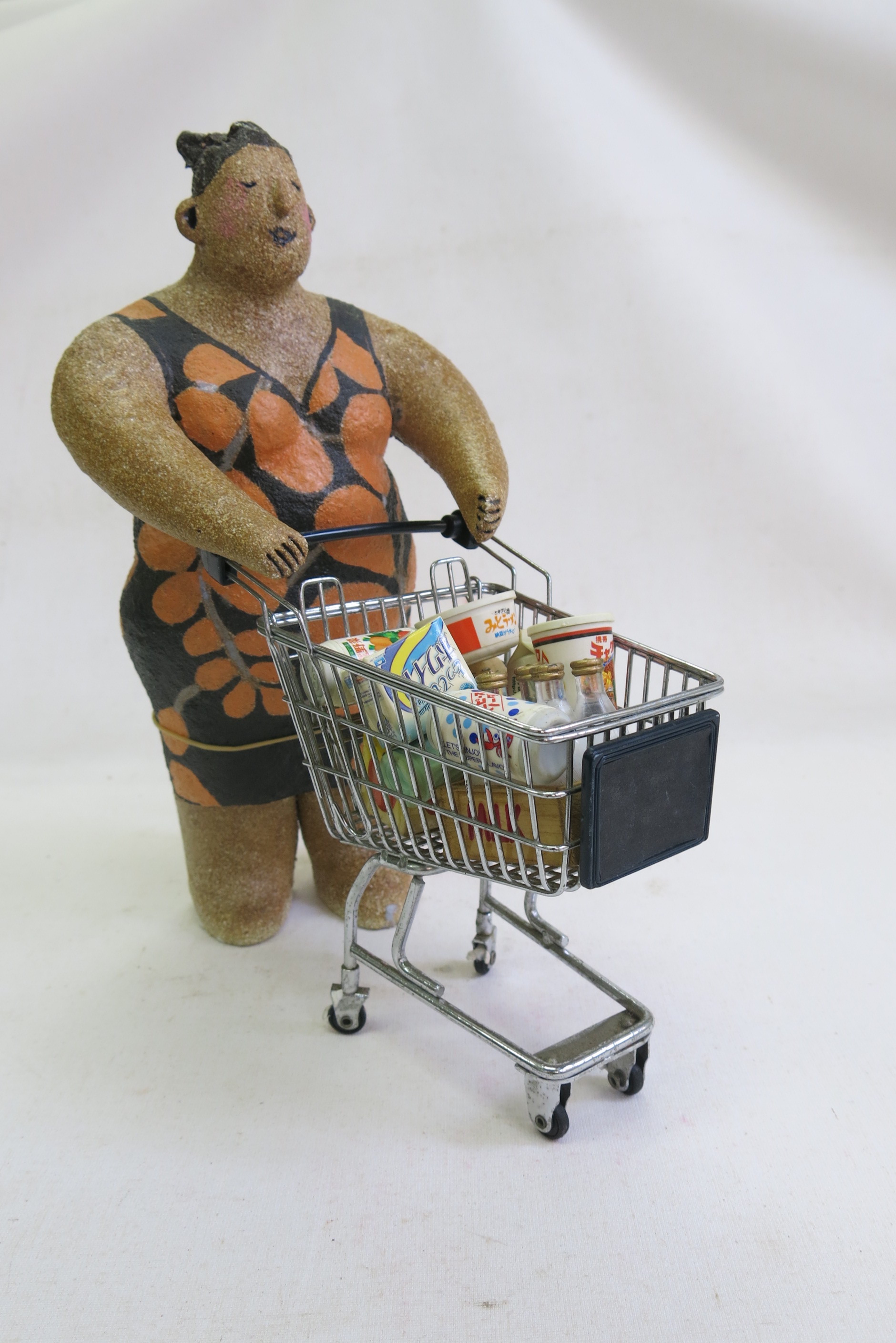 在李慧嫻的作品中,筆者欣賞到不少值得深思的陶塑。作品《超女》中的人物推着超市手推車,車裏裝滿了商品,就像平日所見的「師奶」,她們恨不得有「三頭六臂」去購物,有「金晶火眼」看到優惠商品。雖不是新作,不過放於現時同樣適用——疫情期間,大家也因擔心米、紙巾、罐頭等短缺而去搶購。這些貼地的題材、生活化的陶塑,引起觀者共鳴,拉近大家與藝術的距離,這大概也是她獲獎的原因。