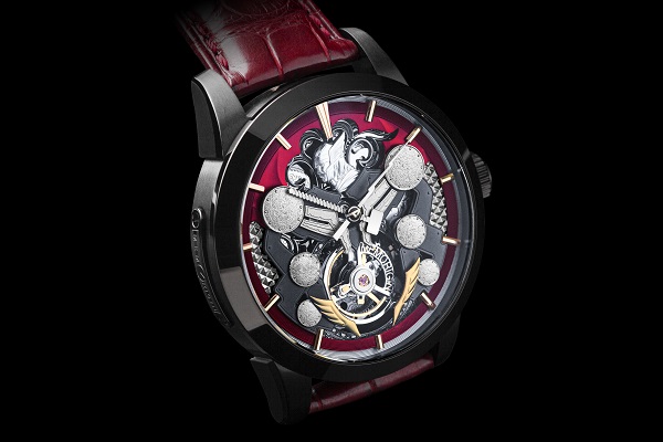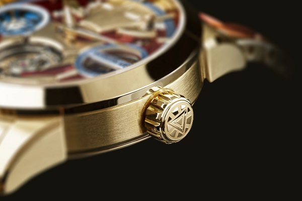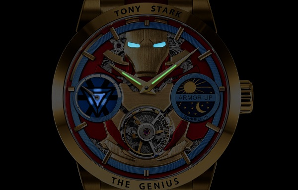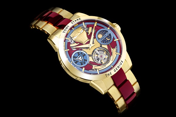 為紀念Iron Man,品牌全新設計限量版陀飛輪,表身以Iron Man鐡甲標誌性的紅色及黃金色為主調。表盤設計以胸甲開合瞬間為靈感,於盔甲間露出內部的機芯零件帶出機械感。表圈上刻有主角名字「TONY STARK」及代表他作為天才科學家的「THE GENIUS」字樣。最重要是在雙眼及反應爐位置加入夜光塗層,完全忠於電影設計,每次Iron Man發動時,雙眼及反應爐位置是率先發光的。