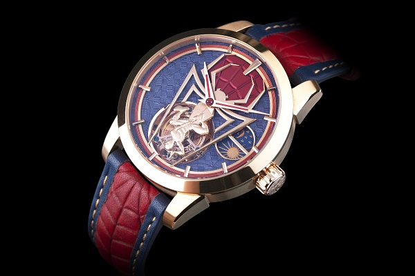 蜘蛛俠限量陀飛輪,表盤以紅色及深藍色的蜘蛛俠戰衣為主調,6時位置的設計是全表的亮點,設計師從指針中心伸延出以蜘蛛絲,倒吊着飛躍的蜘蛛俠在轉動的陀飛輪上,帶出蜘蛛俠的敏捷性。