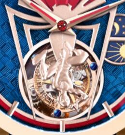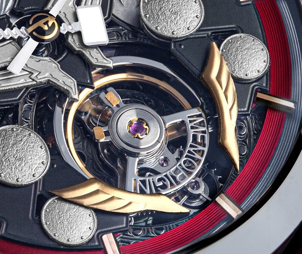 6時位置的陀飛輪兩側,設計師以雷神頭盔兩側的翅膀圖案作點綴。
