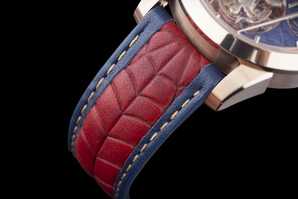 雷神陀飛輪設計靈感源自他的戰衣及武器,設計師把雷神盔甲標誌性的6個鈕扣融合在表盤之內。12時位置及表冠位置加入雷神的漫畫形象浮雕圖案,帶出與電影造型不同的感覺。雷神的力量之源「雷神戰鎚」及「閃雷」造型出現在時針及分針之上。最後設計師用上紅色鱷魚皮表帶呼應雷神的紅色披風,展現出完整的雷神感覺。
