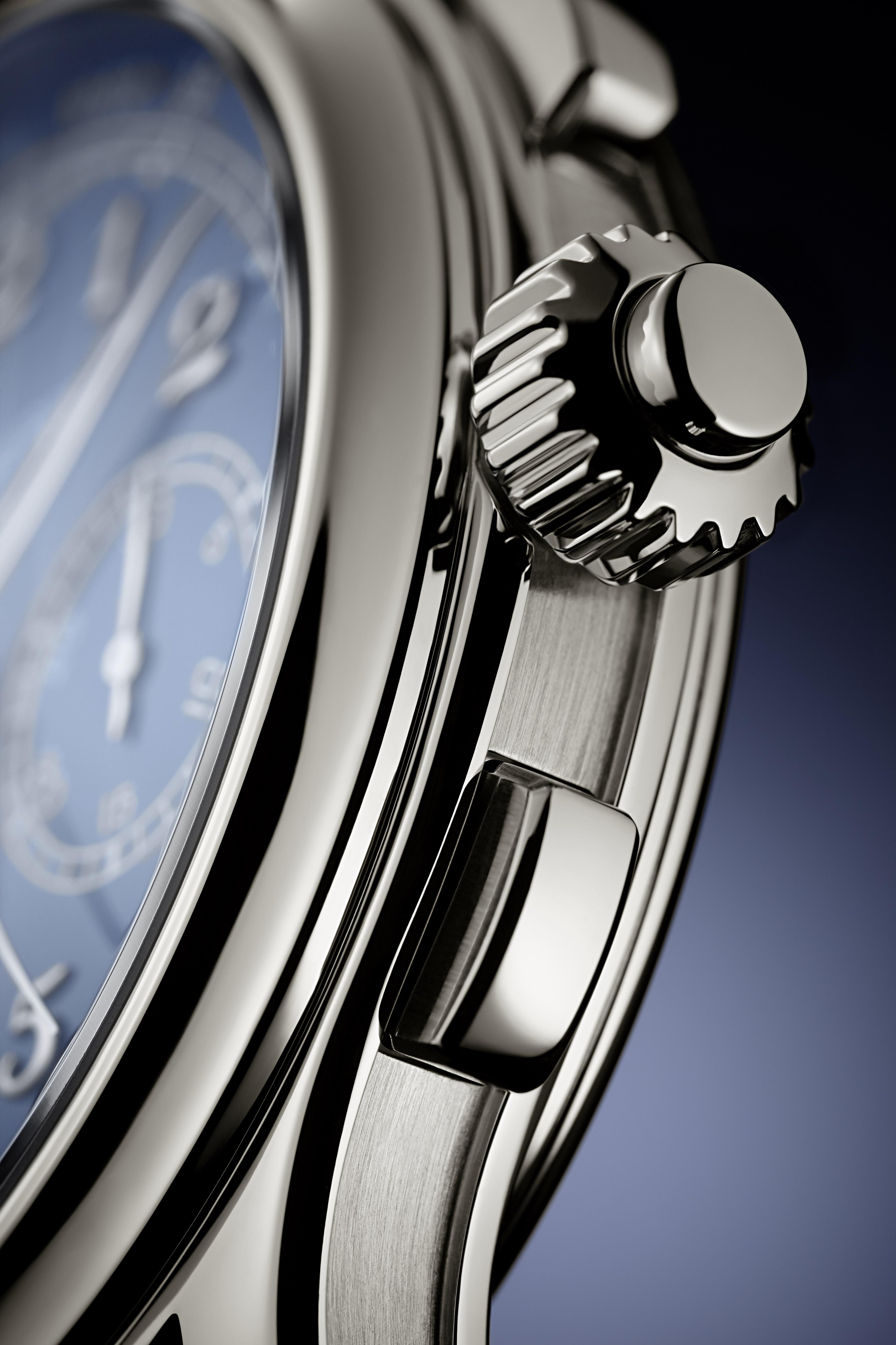 5370腕表在2015年面世,是品牌首款基於CHR 29-535 PS專利機芯製成的雙針計秒計時秒表,搭配鉑金表殼和黑色琺瑯表面。今年5370P以全新藍色大明火琺瑯表面登場,表面塗上夜光物料,搭配白金寶璣式數字,令小時和分鐘展示清晰。計時秒裝置和中央的雙針計秒指針,加上白金30分鐘瞬跳計算器指針及表面上的白色計時秒印製刻度,令計時資料一覽無遺。兩段式計時秒機芯設有兩枚按鈕,用於操控三個計時秒功能,另有一枚按鈕位於表冠,用於啟動與停止雙針計時秒針。這款人手上弦時計兼備傳統特色,採用了導柱輪控制和橫向齒輪離合器。表殼經拋光處理,配搭凹面表環和表側磨拭加工凹槽,加上亮麗深藍色鱷魚皮表帶和鉑金摺疊扣,營造成熟沉穩風格。