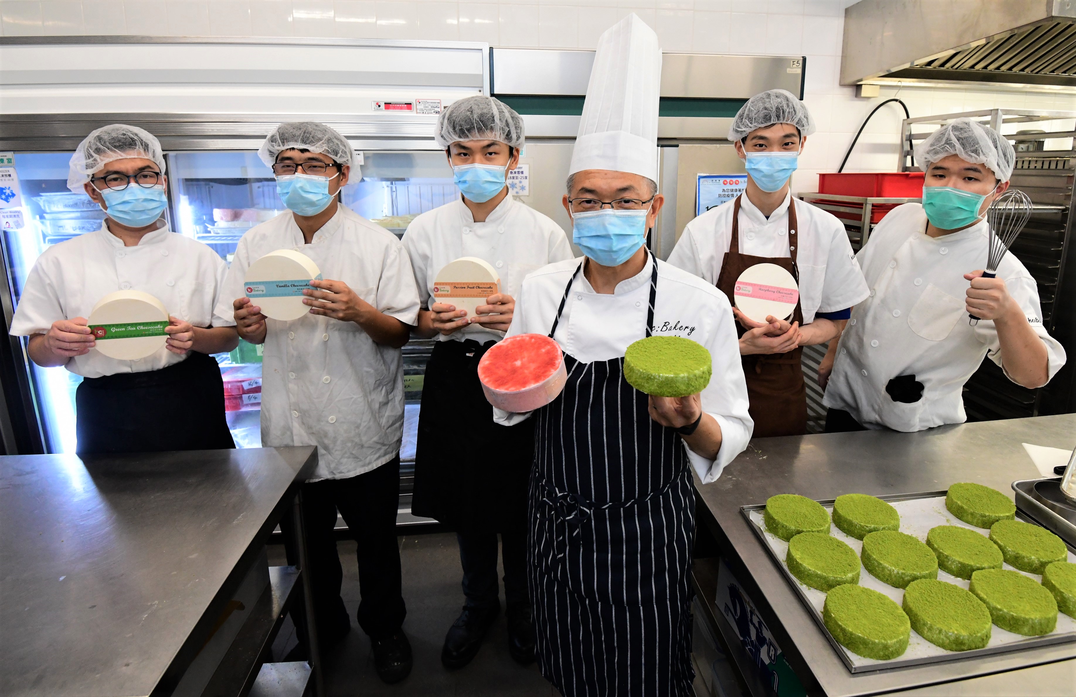 孔志賢師傅(右三)與餅房學員一同製作的紅桑子芝士蛋糕及綠茶芝士蛋糕。