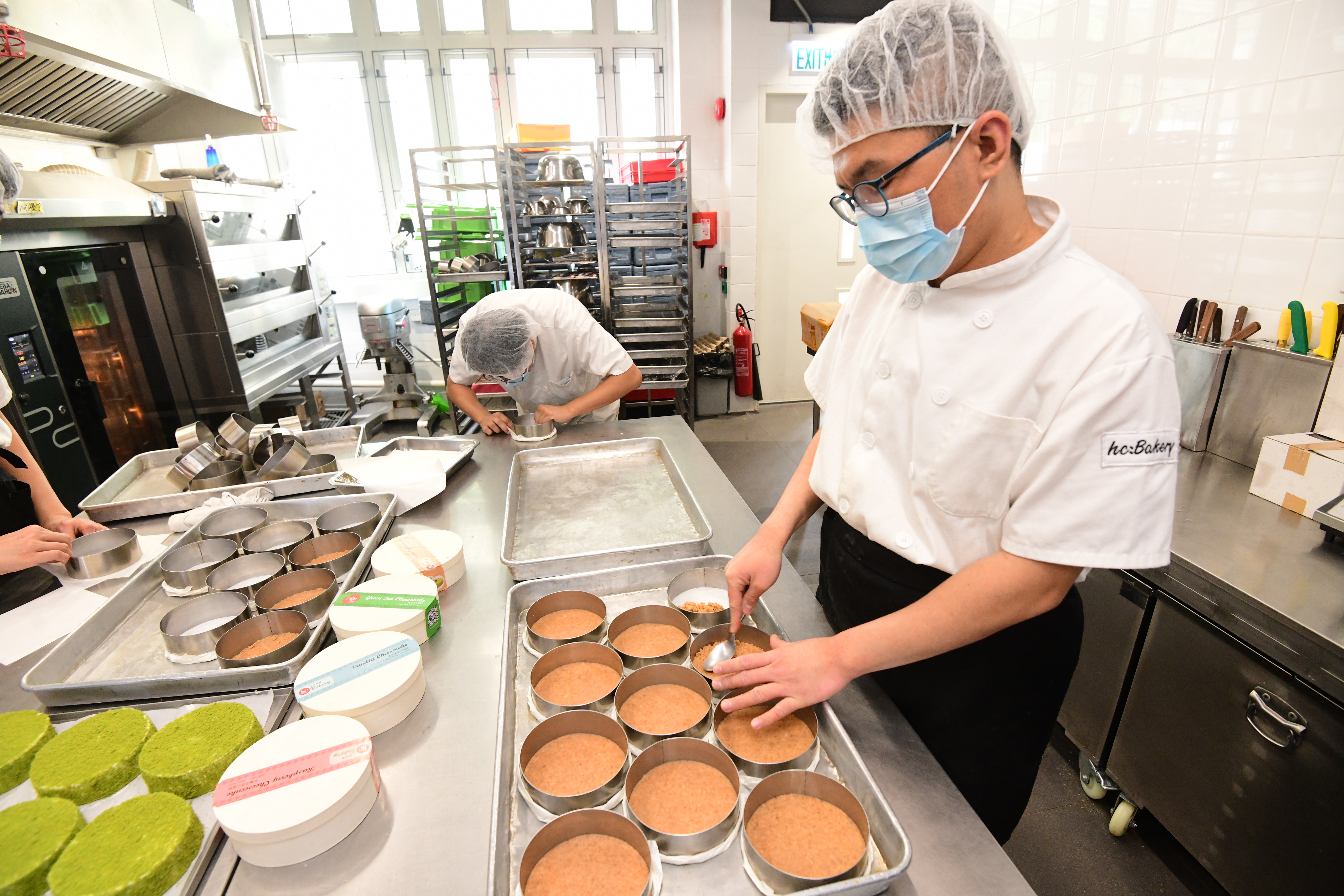 位於大埔的「hc:Bakery」餅房,有一班學員及導師正忙着製作西餅,有學員在整理烘焙紙做餅底、有學員在壓碎曲奇,還有學員利用機器處理食材,每個學員皆手藝純熟,似模似樣,但其實餅房內的均是輕度智障學員。