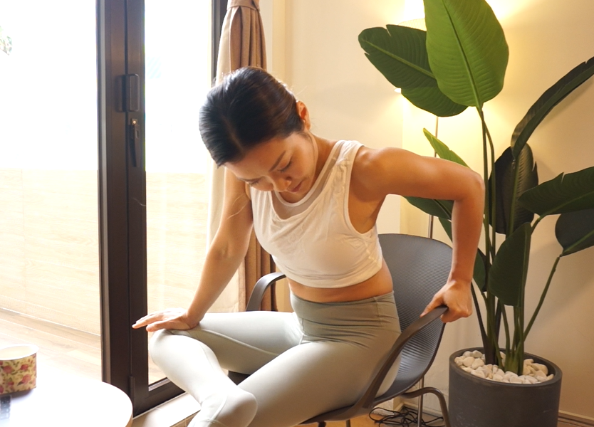 做法:第二式的起始,將右腳踝放在大腿上,挺腰,左手放在椅柄上,右手放在右膝上,向左扭腰伸展髖關節,右手施力壓腿,保持3至5個呼吸,轉另一邊。可做三至五組,較緊的一邊可多做幾次。
