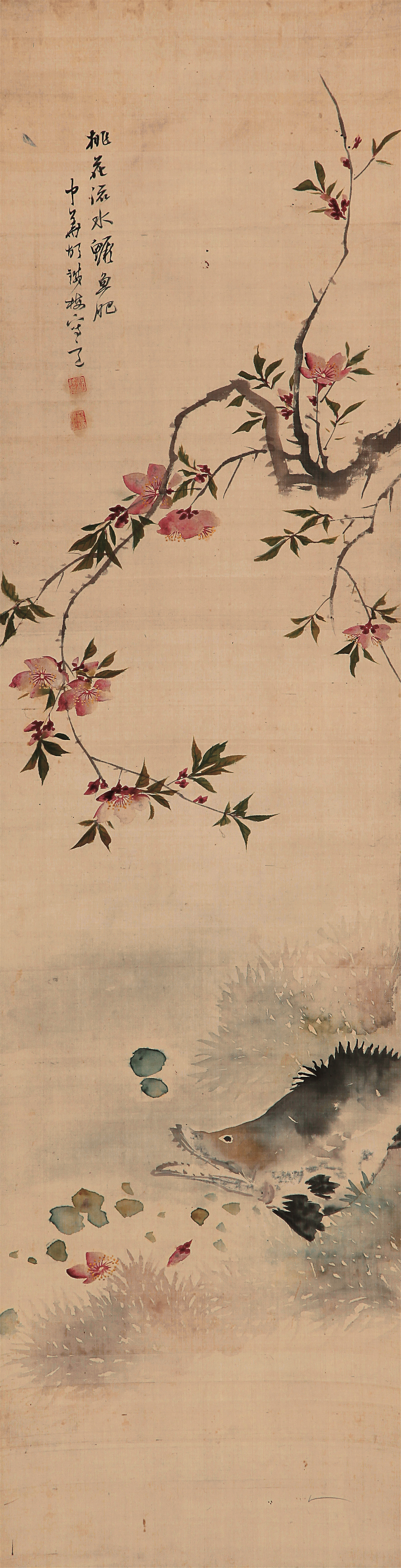 《春潮魚躍圖》充分體現胡鐵梅的筆墨造詣,看似輕描淡寫,卻可從隨意處見功力,從瀟灑間現用意。桃花瘦勁姿媚,氣清而神腴,色淡而意穠,枝、花並不太繁,疏朗爽勁,甚具文人畫逸致。鱖魚,學名「桂魚」,寓意「貴餘」,畫中鱖魚悠然觀花,墨彩渲染之下,形肖神現。構圖上精心設計,整幅畫所用筆墨不多,卻彰顯了豐富的內容。花間流水,只見花未見水的實實虛虛,虛實之間讓人回味無窮,大拓境界。