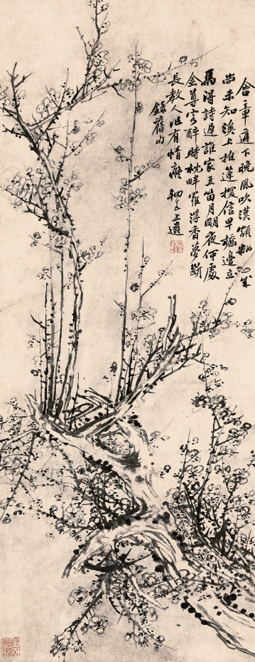 萬上遴的《梅花傲骨圖》風格鮮明,獨具匠心。畫中梅樹老幹盤曲斜臥,梅枝以濃墨寫出,筆直上伸,遒勁有力、疏密有致,洋溢?勃勃生機與不屈意志。梅花則以淡墨或點或勾,紛紛繁繁,散聚有序,顯露出萬玉瓊花密生枝梢的意境。構圖考究洗練,注重物象間的相互襯托與對比,疏密得當,簡繁相依。整幅作品布局獨特,一氣呵成,暢快淋漓,展現了畫家非凡的筆墨功底和獨特的創造力。