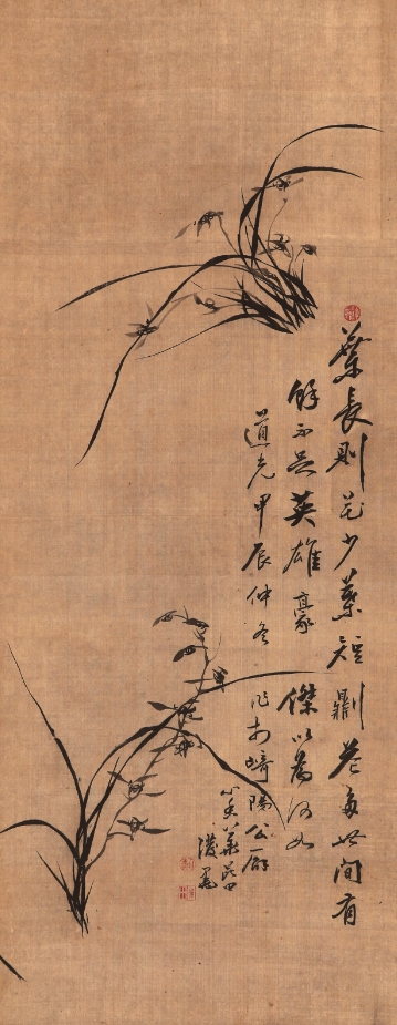 華昆田(近代),名蘭征,號心香。清道光畫家,曾留日,是日本中國畫派的開創者之一。其筆下《墨蘭圖》筆墨靈動,蘭葉婀娜多姿,蘭花淡雅清幽,神韻生動。畫中右上與左下兩叢蘭花,相映成趣,蘭葉看似隨意撇捺,但實際飄逸流暢,幹練蒼勁,充分展示出幽蘭臨風的意態。墨色層次分明,濃淡相宜,渾然天成。畫中的長題將兩株蘭花巧妙地連接在一起,達到了書畫融合的高度統一。作為清代留日的著名畫家,華昆田吸納了日本畫的特點為己用,在此幅畫作中也體現出這一融會貫通的特點,意趣盎然。