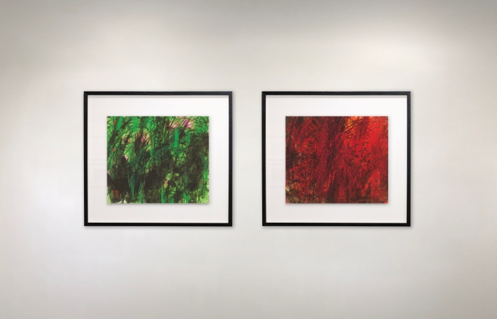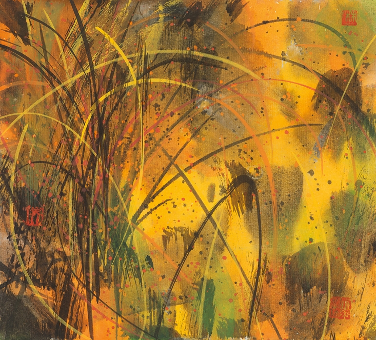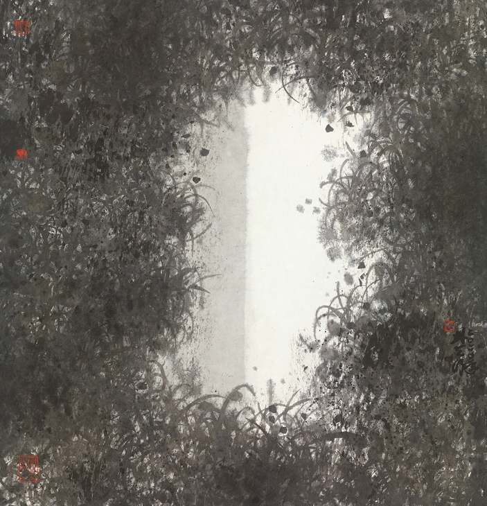 林天行筆下的菖蒲有狂野一面,也有深沉一面,去年的創作偏狂野,今年的則較深沉。《幽思》是今年的作品,亦是畫家第99幅菖蒲系列作品,整體色調是黑白灰,描繪了自四方生長的菖蒲,他解釋:「今年遇到疫情爆發,是完全不同的心情,我感到生命的脆弱、死亡的威脅,所以作品整體沉重,與去年以重彩為主的作風完全不同。《幽思》中間分割成兩個畫面,可看作一扇門,打開是陽光那面。菖蒲代表堅韌,在荷塘、山澗附近常見,是隨處可見的一堆『草』,這種擁有長葉的粗生植物,是中國傳統文化中用以防疫驅邪的靈草,有去邪滅蟲之效,亦代表我對戰勝疫情抱有希望。」現正舉辦的「楚頌新聲.菖蒲集」展覽,展出畫家近兩年創作的逾30件菖蒲系列畫作,觀者可欣賞林天行筆下充滿生命力的菖蒲,從中感受畫作傳遞的抗疫正能量。