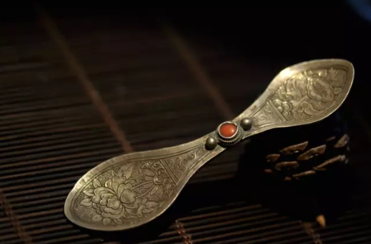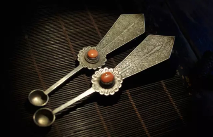 藏式勺子包含了很多藏族艺术的精髓,包括器型、颜色、工艺,涵盖范围非常广泛。从功能上看,藏式勺子主要分为三种,一种是日常生活使用的勺子,一种是法事所需的法器勺,还有一种是藏医专用的有度量功能的勺子。