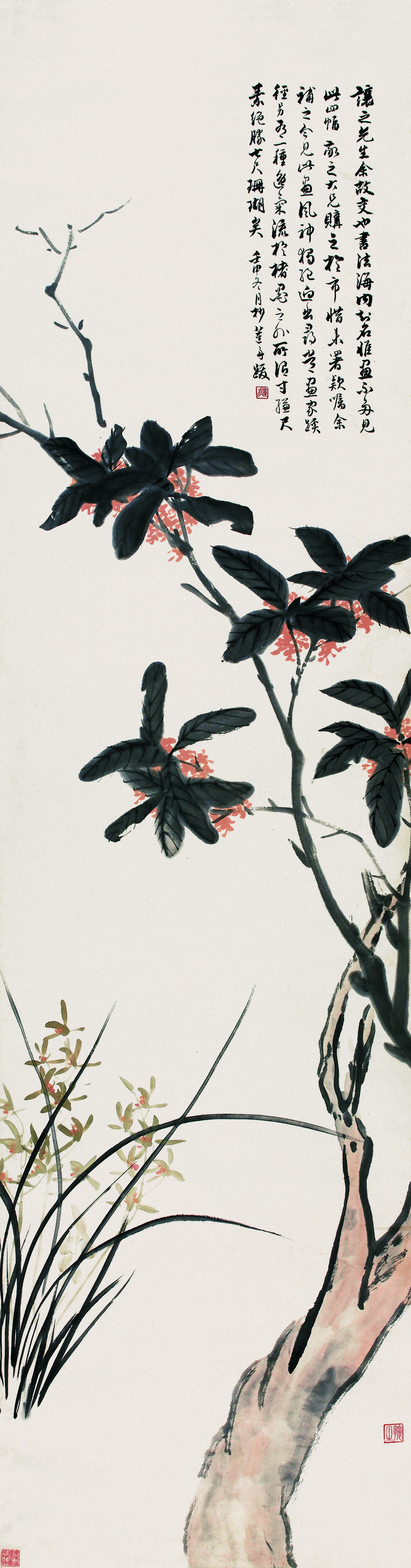 吳讓之的《蘭桂雙清圖》,古艷從容,清雅秀麗,豐韻絕俗。畫幅中桂葉信手揮灑,隨意中透着精謹之態,無論葉的外輪廓、葉與葉之間的濃淡、留白,形狀的走向,筆致的輕重疾徐,無一不精密無懈。左下的幽蘭全用「寫」法,揮運間流露出一種不羈的名士風度,蘭葉如其流麗的書法,筆鋒自然頓挫變化,放中有收,仰俯自如,姿態端秀、別具神韻。吳讓之的國畫創作融合其書法及篆刻技法,走輕捷一路,頗具優雅意趣,行筆靈動,婉暢多姿,任其自然,風格獨特,沒骨設色,色彩通透,花之神態躍然紙上,配以墨色暈染的葉子、枝幹,和用筆爽利的葉脈,使畫面貫穿着一股強健的金石氣韻,生趣盎然。蘭和桂,二者皆有異香,常用以比喻美才盛德或君子賢人。在國畫中用桂花和蘭草合成吉祥圖畫,又有祝願家中子弟成才的寓意。