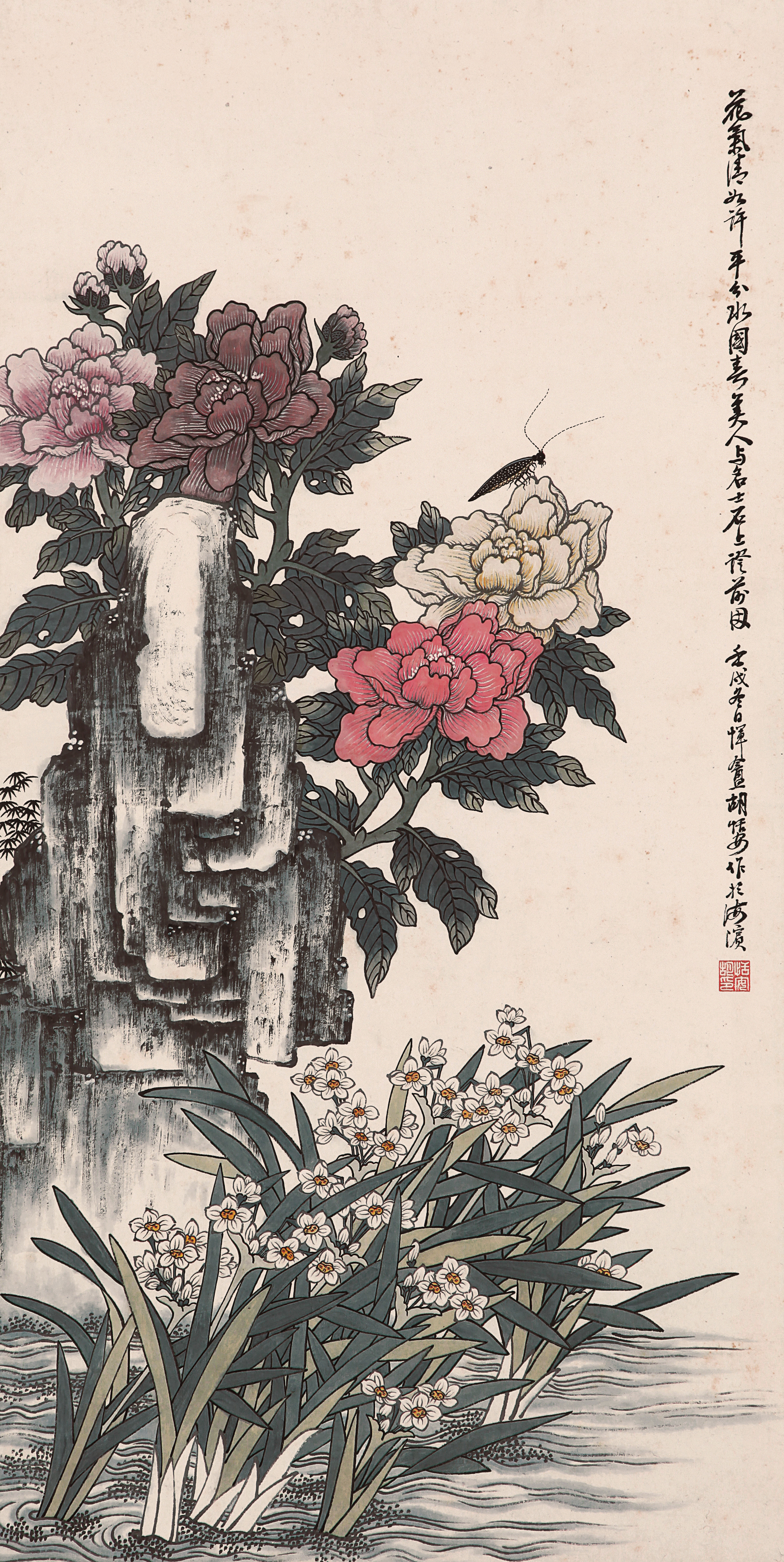 牡丹國色天香,雍榮華貴,象徵富貴、繁榮;水仙冰肌玉骨,儀態超俗,雅稱「凌波仙子」,又因為開花於新春佳節之際,被視為新歲之瑞兆。牡丹與水仙同畫,乃「神仙富貴」,寓意神佑富貴、吉祥幸福。