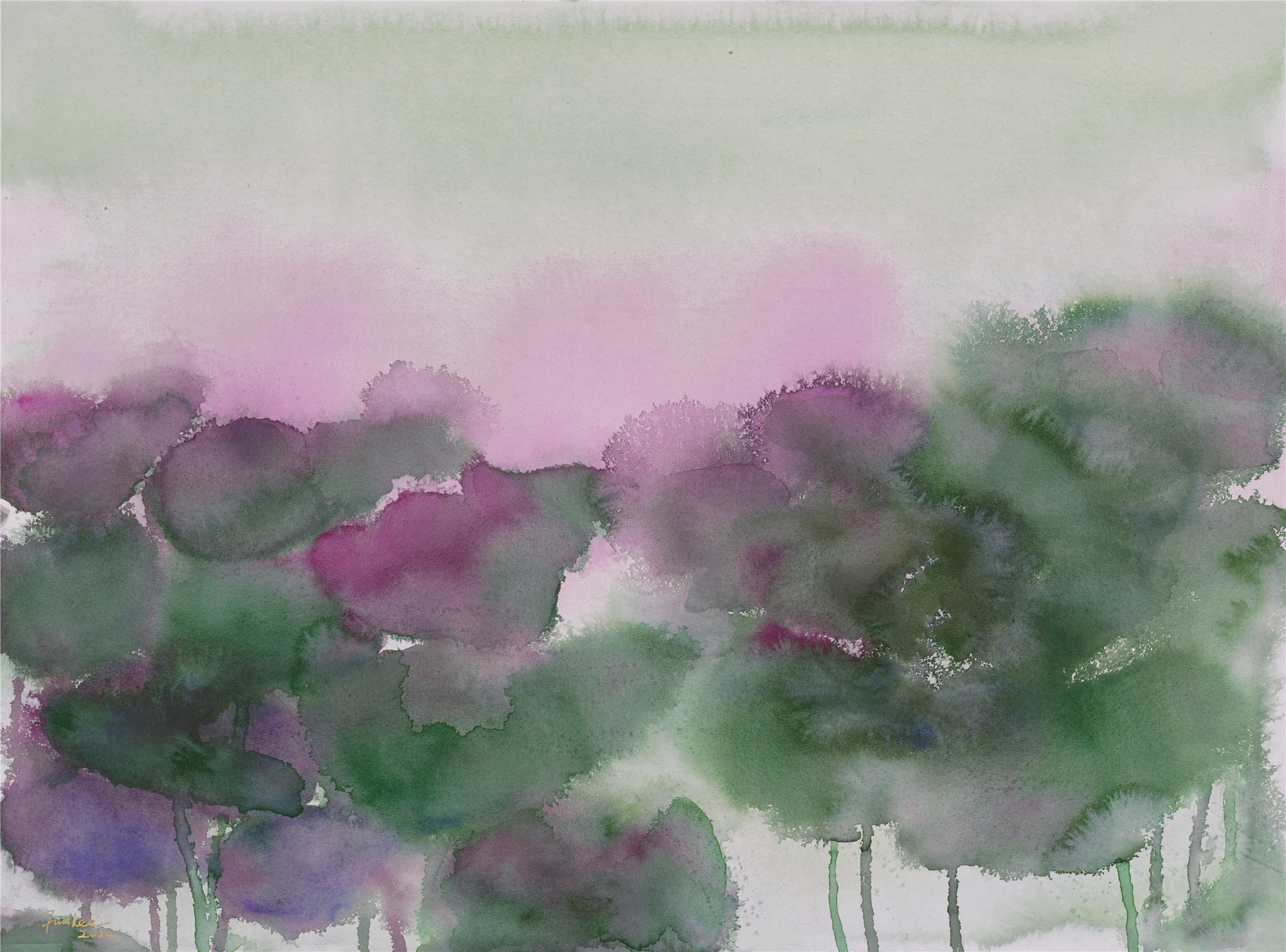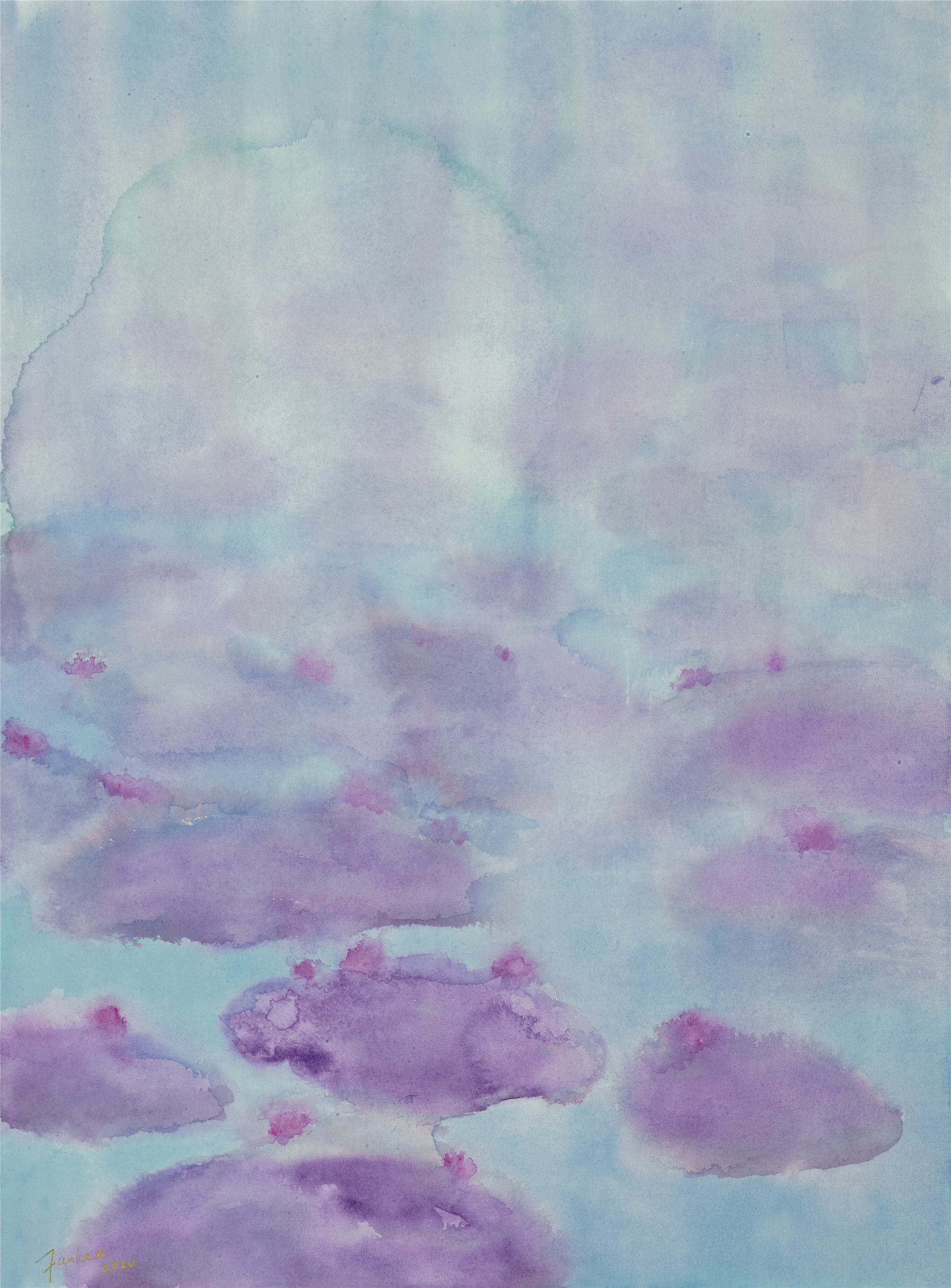 我的水彩畫「紫輝瑞彩」系列的靈感來自早晨和黃昏時候的荷池。無論是天剛破曉或是暝色聚合,不管是在朝霞還是晚霞的襯托下,荷塘都是那麼的誘人。天光湖色相輝映,荷葉田田,蓮花濯濯,重疊葳蕤,互相依倚,在瀲灩波光中搖曳,在妍麗的晨靄夕霏中異彩紛呈,明暗深淺,交錯映照,絢爛多姿,使人目不暇接,賞心悅目。 文:蕭芬琪