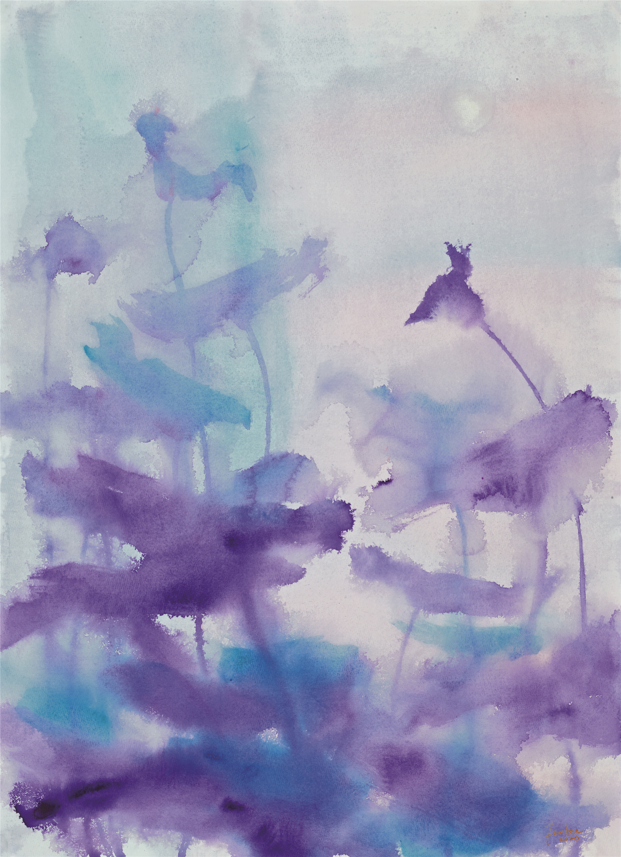 「荷風抱月」系列緣物寄情,把對內在精神、氣韻的追求運用於水彩畫中,將這些精神和氣韻體現在對詩的意境的呈現,在浪漫瀟灑的意境中去尋求藝術內涵的空靈、深遠與虛實,以探索一種民族化的詩畫結合的不凡境界。