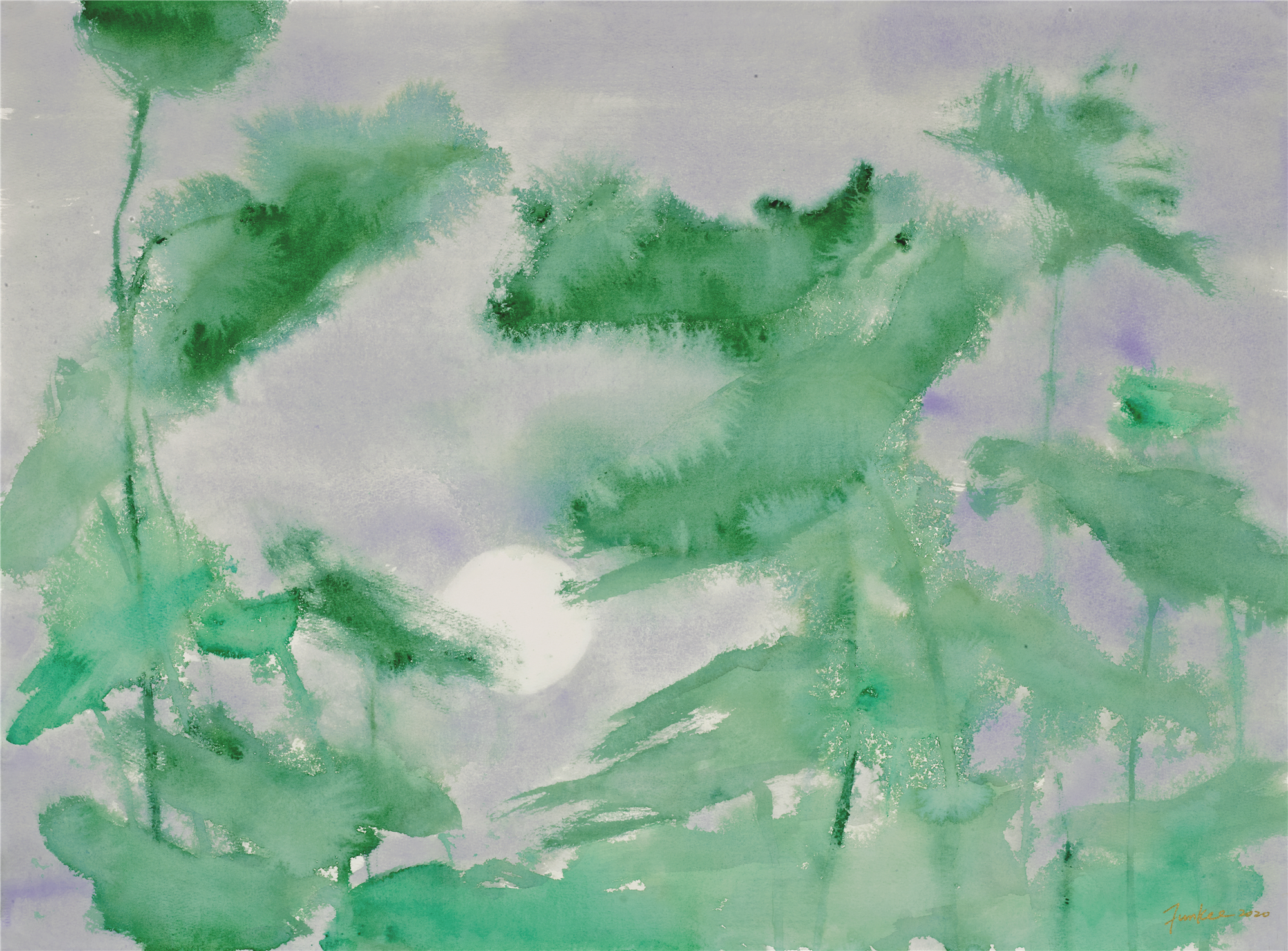 蕭芬琪的「荷風抱月」系列作品《翠扇邀月舞》(水彩畫),2020年。58x78.5cm。