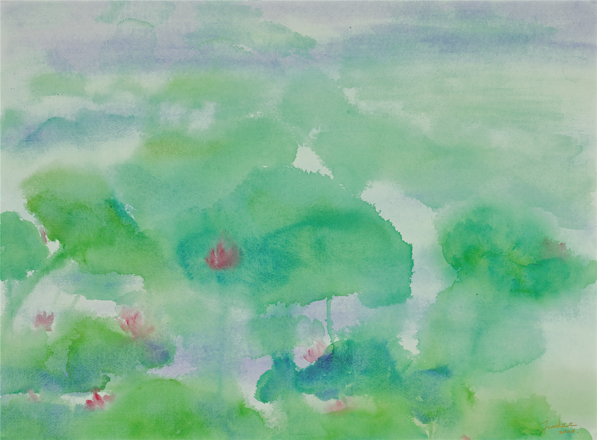 除了視覺上令人賞心悅目之外,我同樣重視精神與內容。此系列畫作以寫意為主,通過游動空間、隨形賦彩等手段,強調藝術韻味,追求「氣韻生動」。一切色彩與色彩之間,形體與形體之間的銜接,皆在水色濕潤中展開,柔和而不混亂,朦朧中透着優美。在一片虛化的背景中,搖曳的荷在水分中顯得更加柔軟而有光澤。水彩畫和中國畫一樣講究意境,其妙處在於似無言又無所不言。在靈動的色彩變化中,在深思熟慮的色調構思裏,我追求着一種幽雅清遠、澹泊自然的神韻,探索着一種生動的、充滿生命力的意境美。