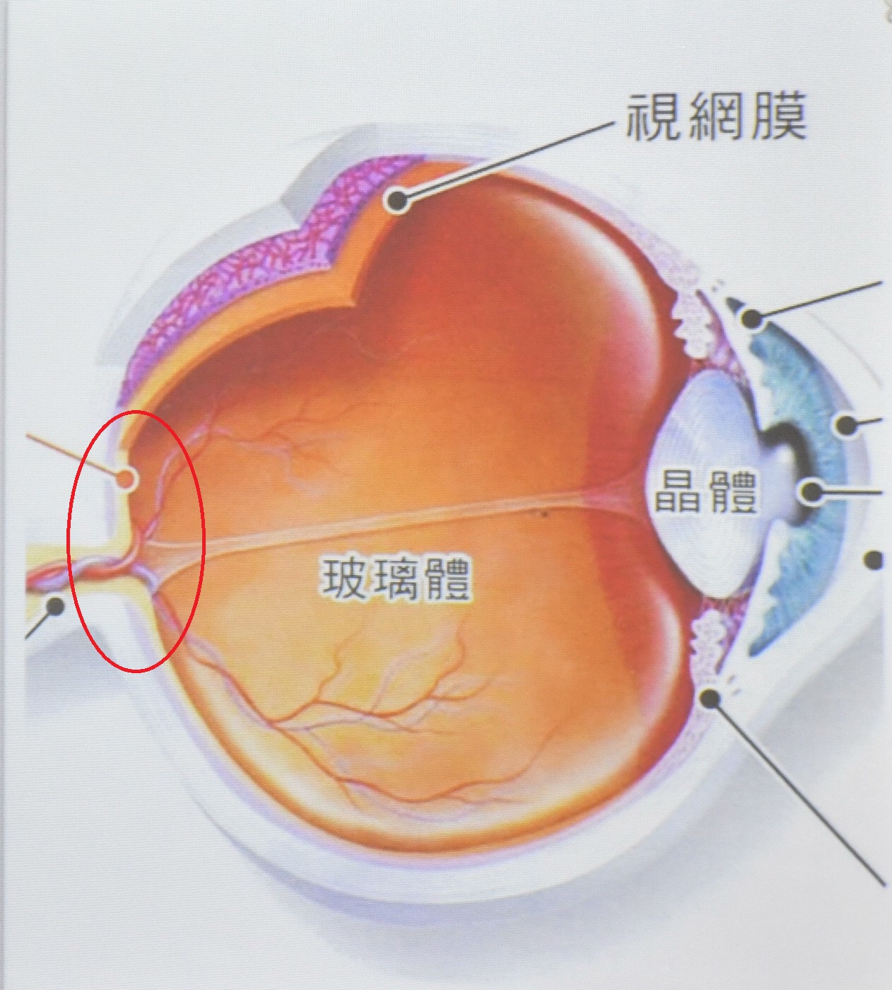 黃斑部位於眼球正後方的視網膜中心(紅圈示),負責分辨顏色。