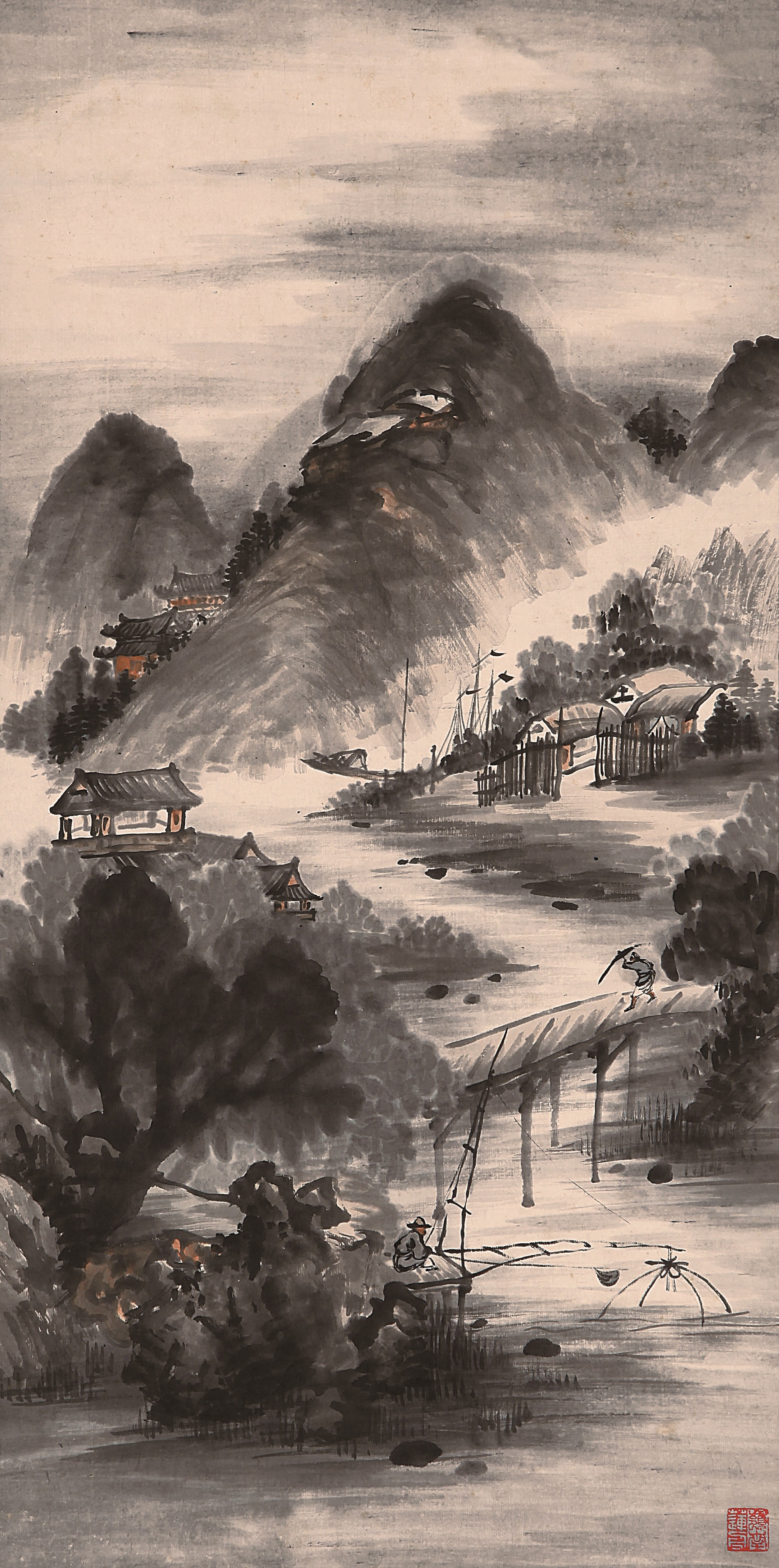 《雨中閑釣圖》丘壑幽奇,陰陽向背處,皆能渲染入微,山的上半部分墨色略濃且用筆稍密,而下半部分則相反,墨色略淡,用筆也稍疏,山的上下部分因此形成了鮮明的對比,畫家用隱含其中的筆痕,依勢反映出山的結構與凹凸,表現出山的情味與質感。山水相依,水隨山勢,墨的濃密將畫面的層次感鮮明地展示出來,造成極其強烈的視覺效果。