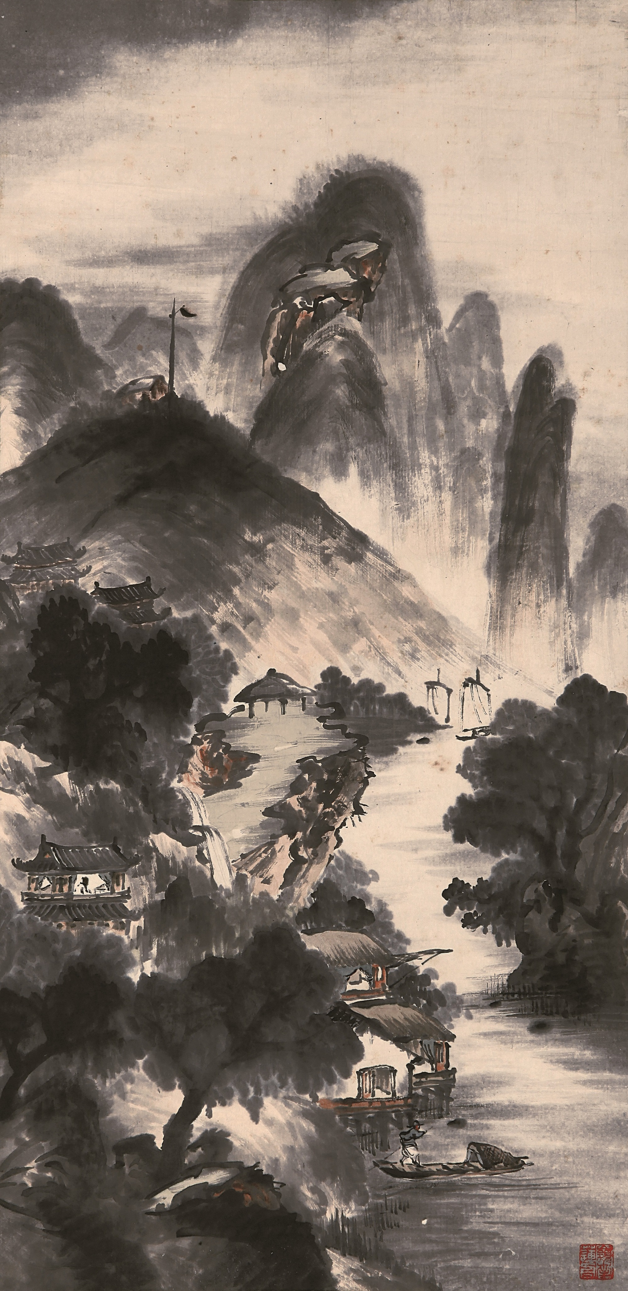全圖描繪嶺南山雨欲來之景,樹木蓊鬱,溪水湍流,樓觀錯落,近景處一艘篷舟,舟首一位船夫正在撐篙,人物雖小但勾描工中帶拙,形神兼備。(文:蕭芬琪)