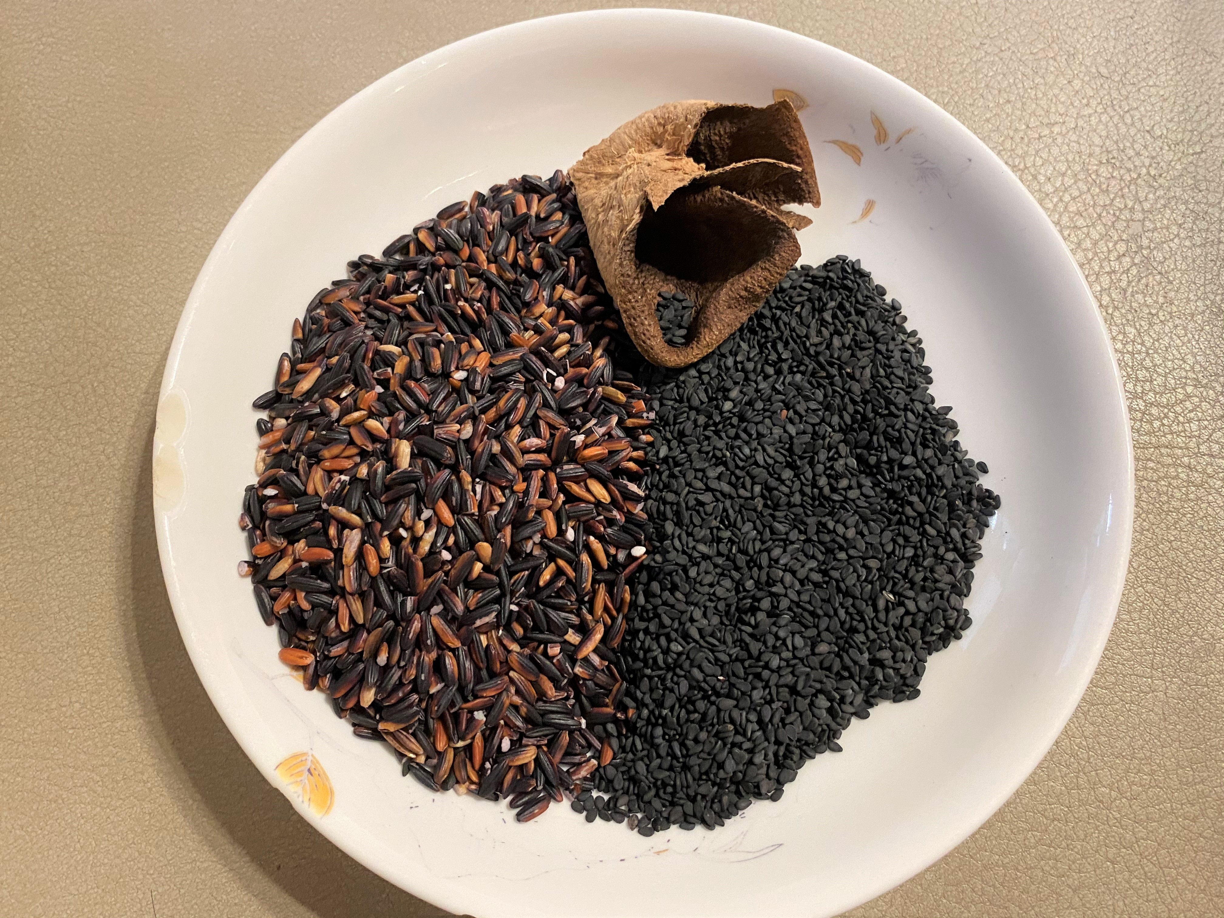 材料:黑芝麻30克、黑糯米60克、陳皮1塊、黑糖少許、水適量。