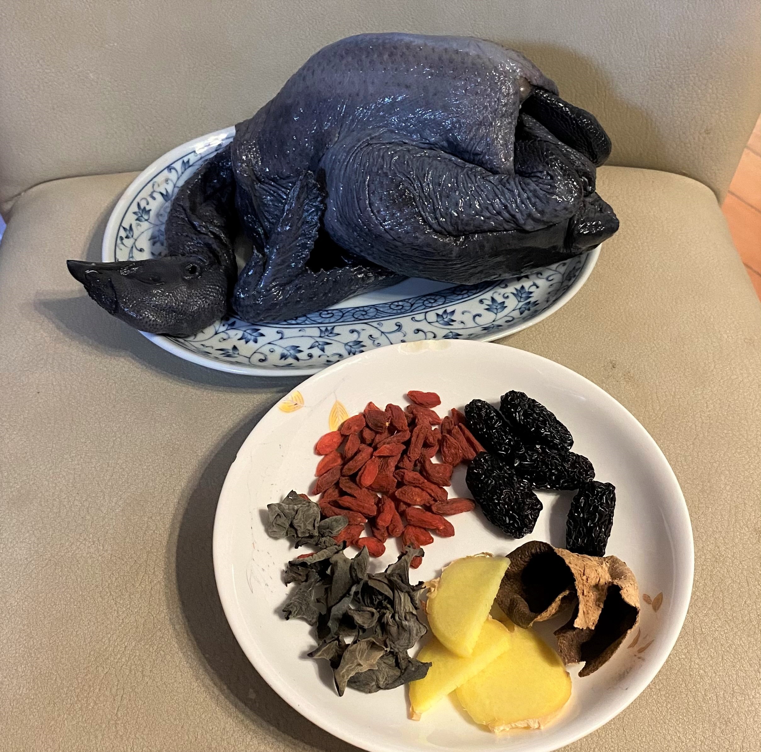 材料:烏雞1隻、黑棗5粒、杞子10克、黑木耳3朵、薑3片、陳皮1塊、水3000毫升、鹽少許。