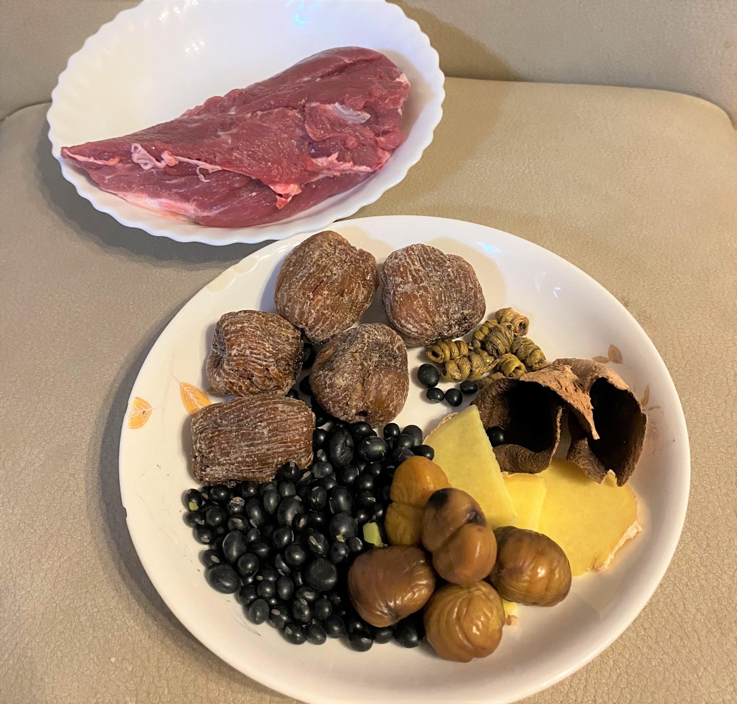 材料:栗子肉150克、黑豆50克、石斛15克、蜜棗5枚、瘦肉1.5斤、薑3片、陳皮1塊、水3000毫升、鹽少許。