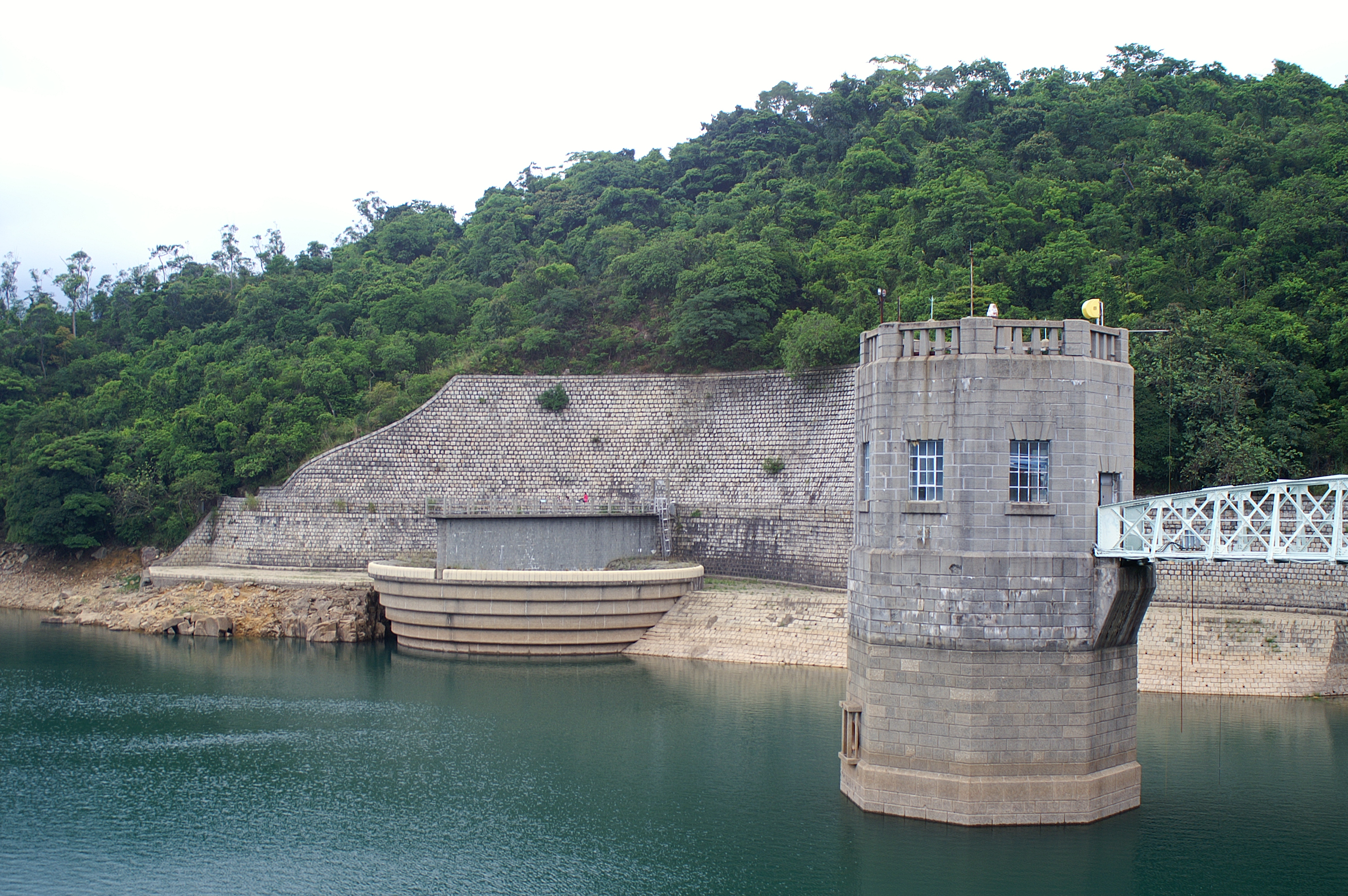 城門水塘水務設施:鐘口型溢洪道(左)及出水塔(右)。