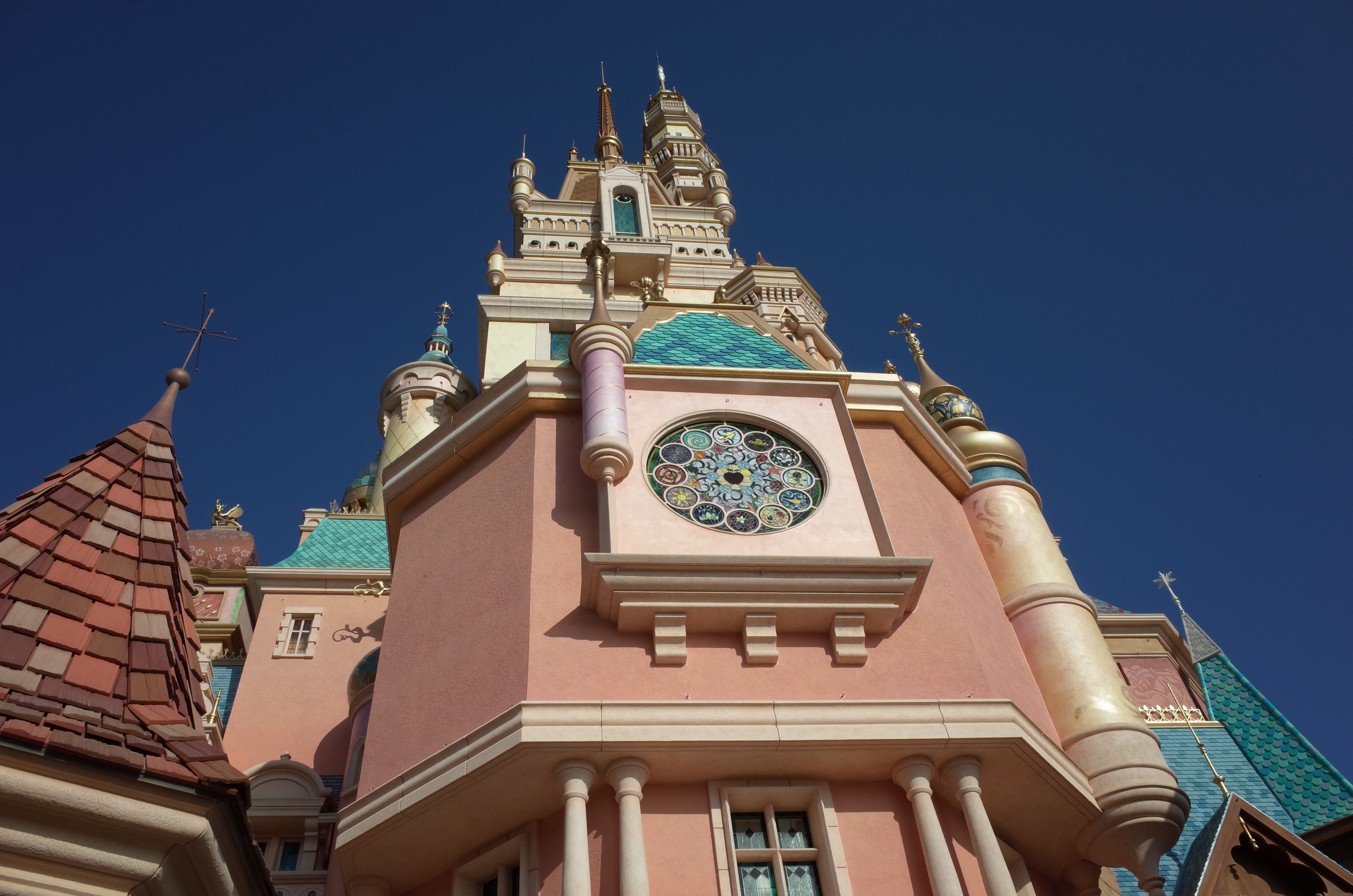 在城堡前抬頭一看,會發現每座塔樓及尖頂都擁有獨特的顔色配搭、標誌圖案和紋理裝飾,原來是代表著13個關於迪士尼公主及女王的故事,這個時候便考驗觀者對迪士尼故事的熟悉程度了,包括白雪公主的金蘋果、灰姑娘的金色南瓜車、貝兒的魔法玫瑰、安娜與艾沙的銀光雪花。而代表愛洛公主的城塔,則是城塔中最高的一座,掛上金光閃閃的王冠,為向昔日的「睡公主城堡」致敬。