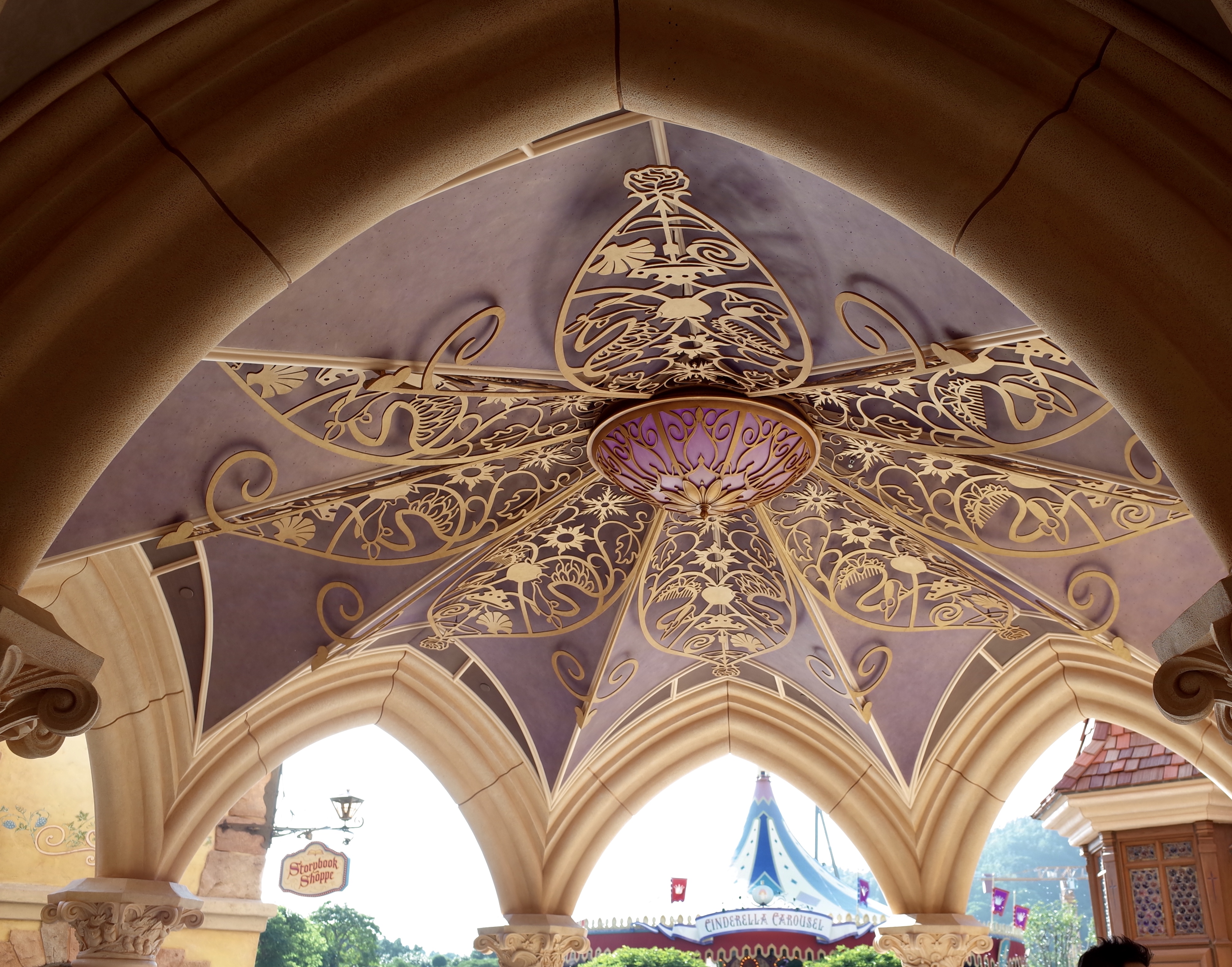 位於城堡西面入口上方正中央的圓花窗,將13個經典迪士尼公主和女王故事的標誌和花朵圖案,結合成一幅畫,是粉絲不能錯過的亮點。