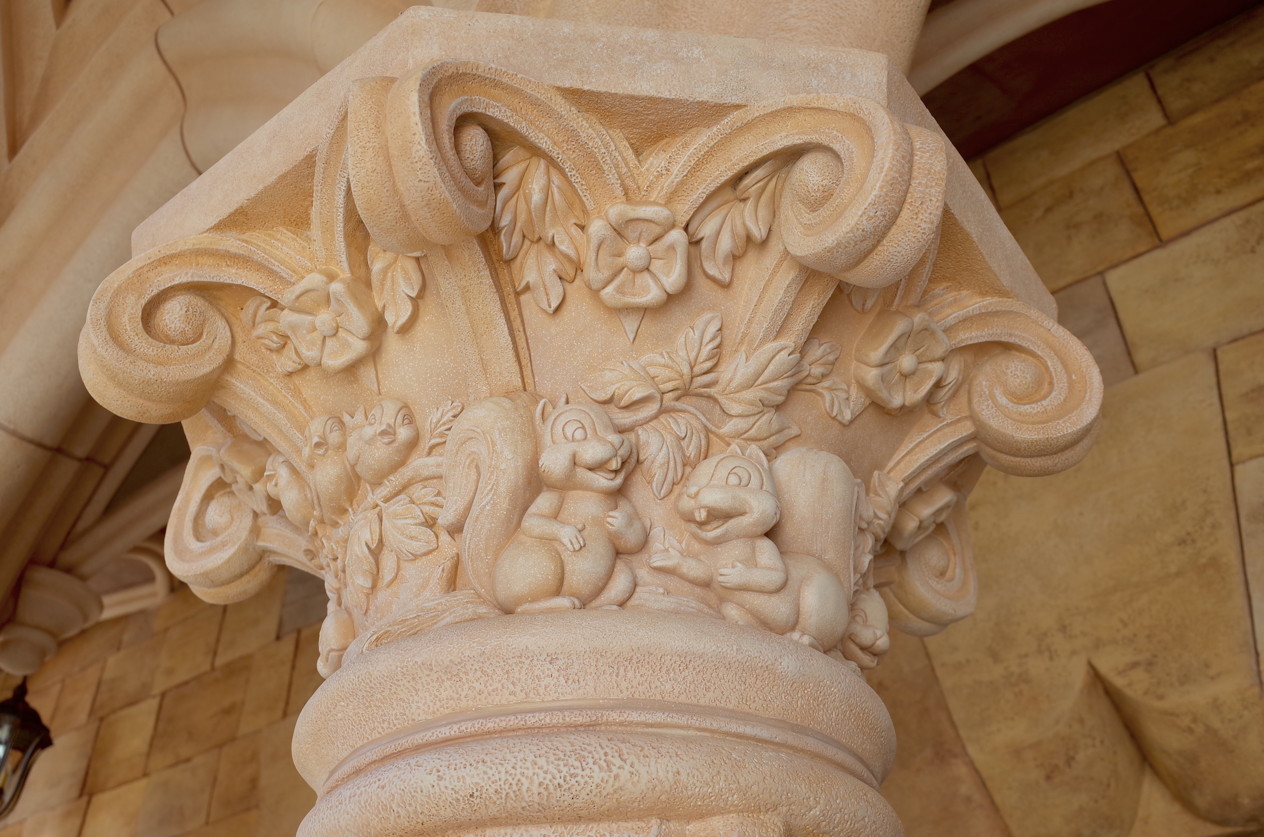 公主及女王享有主角的光環,但她們身邊的忠心好友,也值得被人記住。城堡設計者沒有忘記他們,在圓頂廣場內13條圓柱頂部的雕刻上,刻記了這群默默發光的配角。