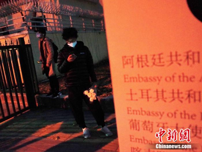 幾個大學生模樣的年輕人手捧鮮花,隔著柵欄,遠遠地望著使館院內的燈光,和旗杆下的紀念台。