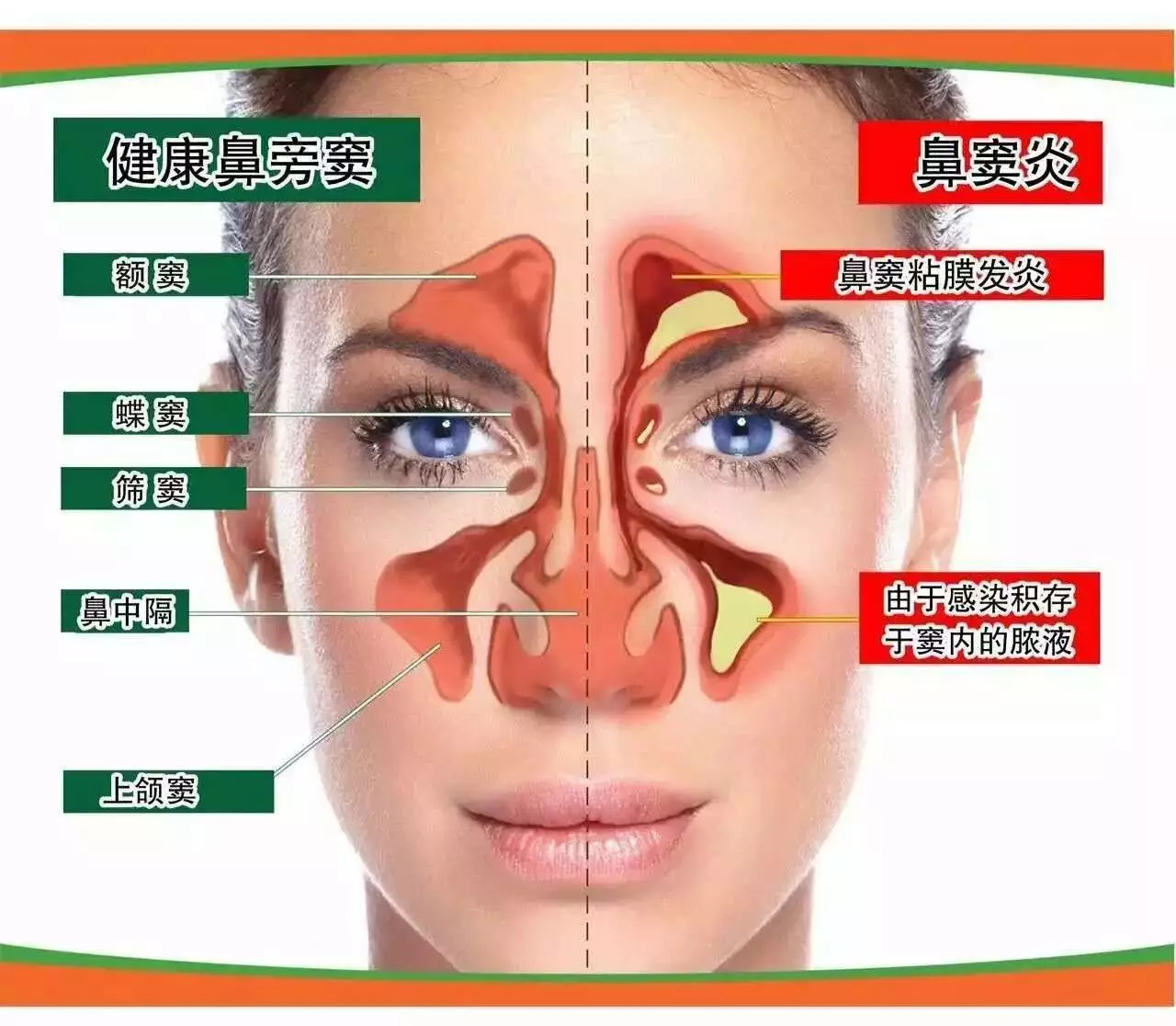 首先,了解鼻腔內原來有分布四對鼻竇,即上頜竇、篩竇、額竇和蝶竇。它們都是在骨骼之間的空腔,而且腔內襯有黏膜。黏膜有豐富的腺體,這些腺體會分泌出黏液,黏液是通過纖毛運動從鼻竇的自然開口排出鼻孔;故此,鼻竇必須要保持通氣,才可確保呼吸順暢的生理功能。可是當人患上感冒,鼻竇內就會充血水腫,鼻竇口就受到阻塞,使黏液不能正常排出,變成炎症,再之病菌感染,鼻涕呈黃稠黏液性,形成膿性分泌物堵塞引起頭痛、頭脹、睡覺打鼻鼾、還有擤鼻涕時常有擤之不盡的問題。