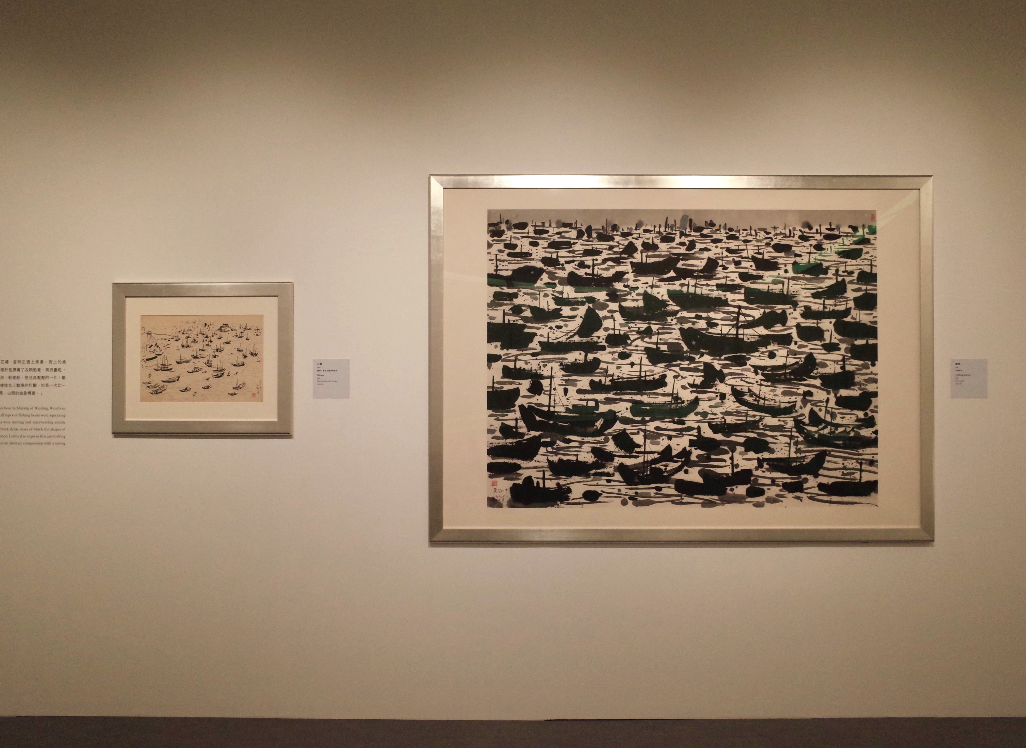 吳冠中作品《石塘》(左)和《漁港》(右),兩幅展品呈現畫家從實景到半抽象的創作過程。