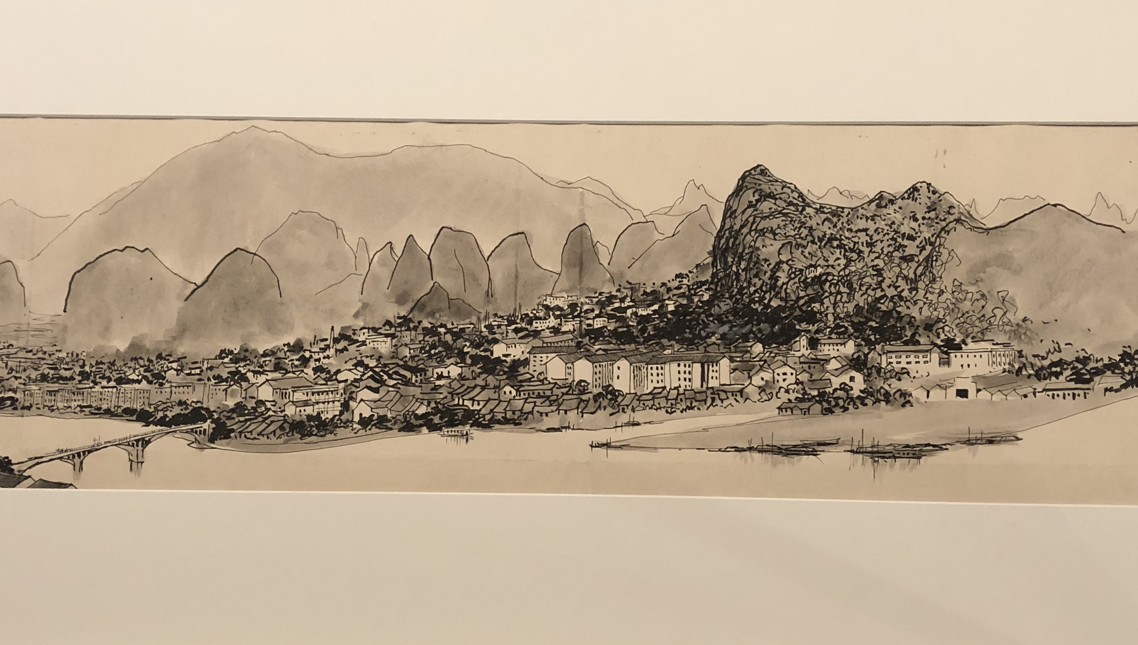 吳冠中曾說,他從上世紀50、60年代開始,就揹著畫箱在野外創作。他的作品除都市外,大自然題材也很多。吳冠中的速寫作品展現他到訪內地美景,如江南故鄉的烏篷船、桂林的山景等。是次展覽中,重點展品要數《桂林全景寫生稿》。1972年,吳冠中探親經過桂林,被當地美景吸引,「他認為若寫生某一處,『至窺其一斑,不見全豹』,所以他構思將四幅寫生作品拼接,完成如同國畫手卷般的作品。」鄧館長解釋,該展品如同國畫一樣,採用多點透視法,並將焦點放在前方的屋宇、建築上,畫得非常細緻,後面的山勢僅勾畫線條,在布景方面展現了畫家使用線條出神入化的地步。在這幅充滿線條美感的風景寫生背後,是吳冠中四處探景到深夜、冒著風雨下創作的,紀錄畫家捕捉美的過程。