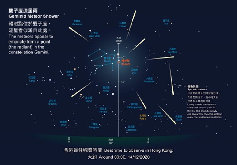 每年都上演不同的流星雨,雙子座流星雨則在每年的十二月中最為活躍,而且相對明亮,速度較慢,數量多而且穩定,十分適合目視觀看。根據香港太空館的資料顯示,今年流星雨高峰期位於12月13至14日,本港最佳觀賞時間12月14日的淩晨2時至3時。預測在高峰期間,流星雨的天頂每小時出現率可達到150顆,該出現率是今年所有流星雨現象中最高,加上不受月光影響,觀測條件極佳。