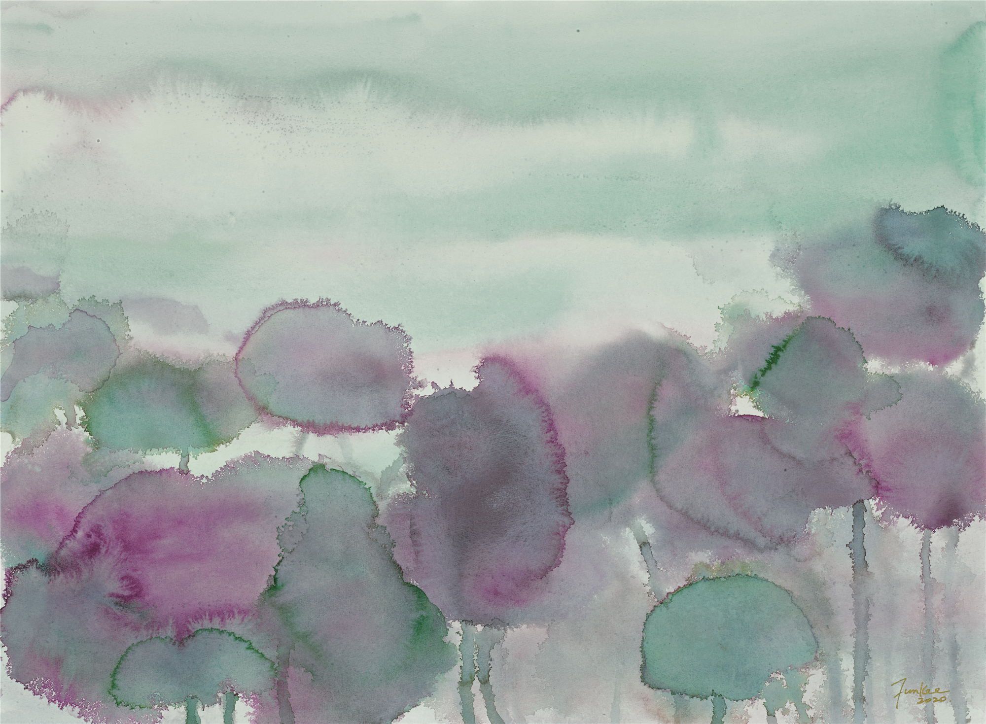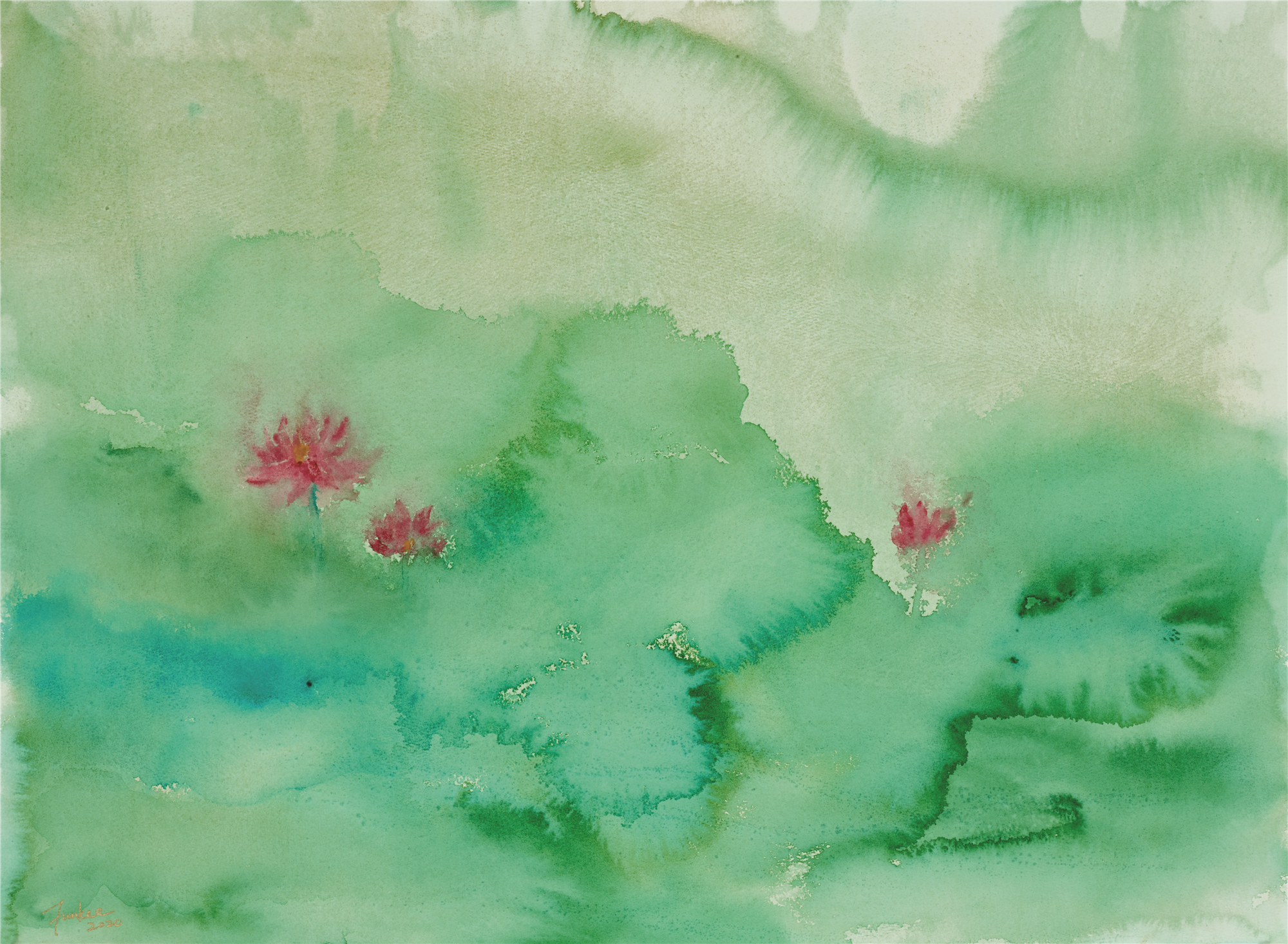 借鑒傳統題材用水彩肌理嘗試表現中國氣韻,這是一種嘗試更是一種探索。此系列融合了中國傳統的繪畫語言,追求「意境之美」,不僅採用西方繪畫的寫實手法,同時也有著東方的水墨式的抒情性語言。面對同一題材的荷花,不同人的主觀意識會創作不同的作品,這種不同取決於自身的繪畫語言,這種語言是畫家自身圖式的呈現,也是畫家真實的情感寫照。花葉之嫣然,山嵐之炫然,互為映襯,呈現一派絢爛輝煌的氣象。我想,我的「山映曜姿」系列至少實現了對大自然的一個側面的洞見;山雖靜穆,卻負載著強烈能量;荷雖飄搖,濃淡顏色卻產生感染力。從這些作品中,可以看到我微妙的猶豫與謹慎,和對各種感悟新知的急切嘗試,而所有這些都是一顆真摯而敏銳的心靈所留下來的痕跡,而洋溢在其中的,依然是我在「色彩遊戲」中永恆的舒心愉悅之情。 (文:蕭芬琪)
