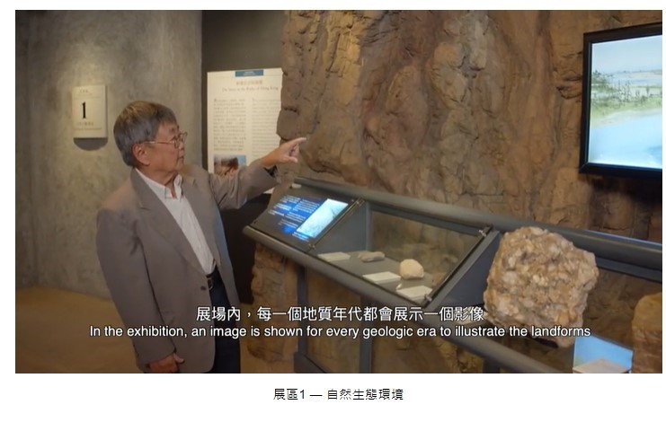 在「展區1——自然生態環境」丁新豹教授介紹香港不同地方的岩石及地質發展歷史。(網站截圖)