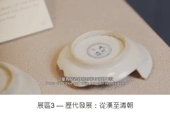 在「展區3——歷代發展:從漢至清朝」講解於竹篙灣(現時迪士尼樂園所在地)發現的青花瓷,部分青花瓷底部帶有明朝年款。(網站截圖)