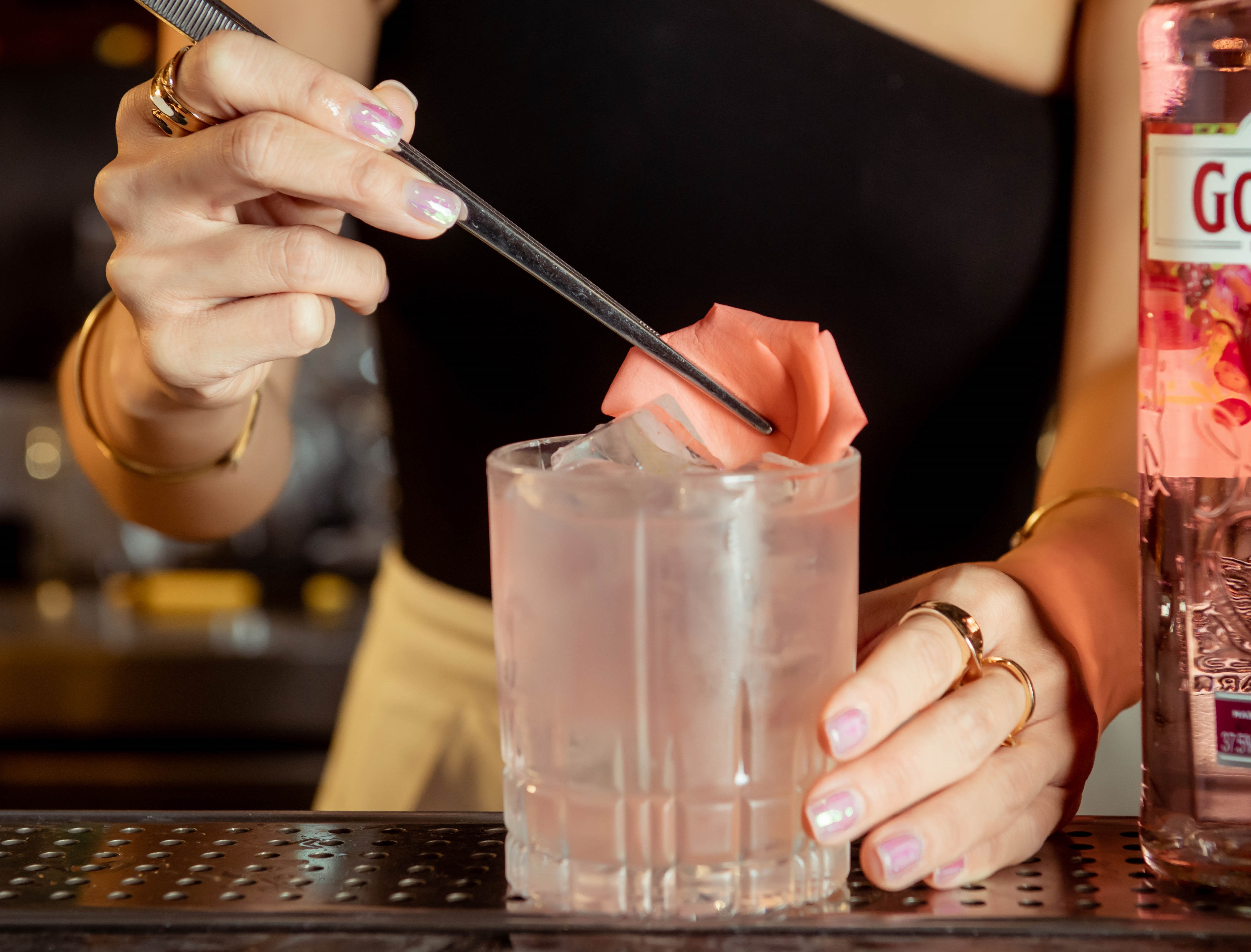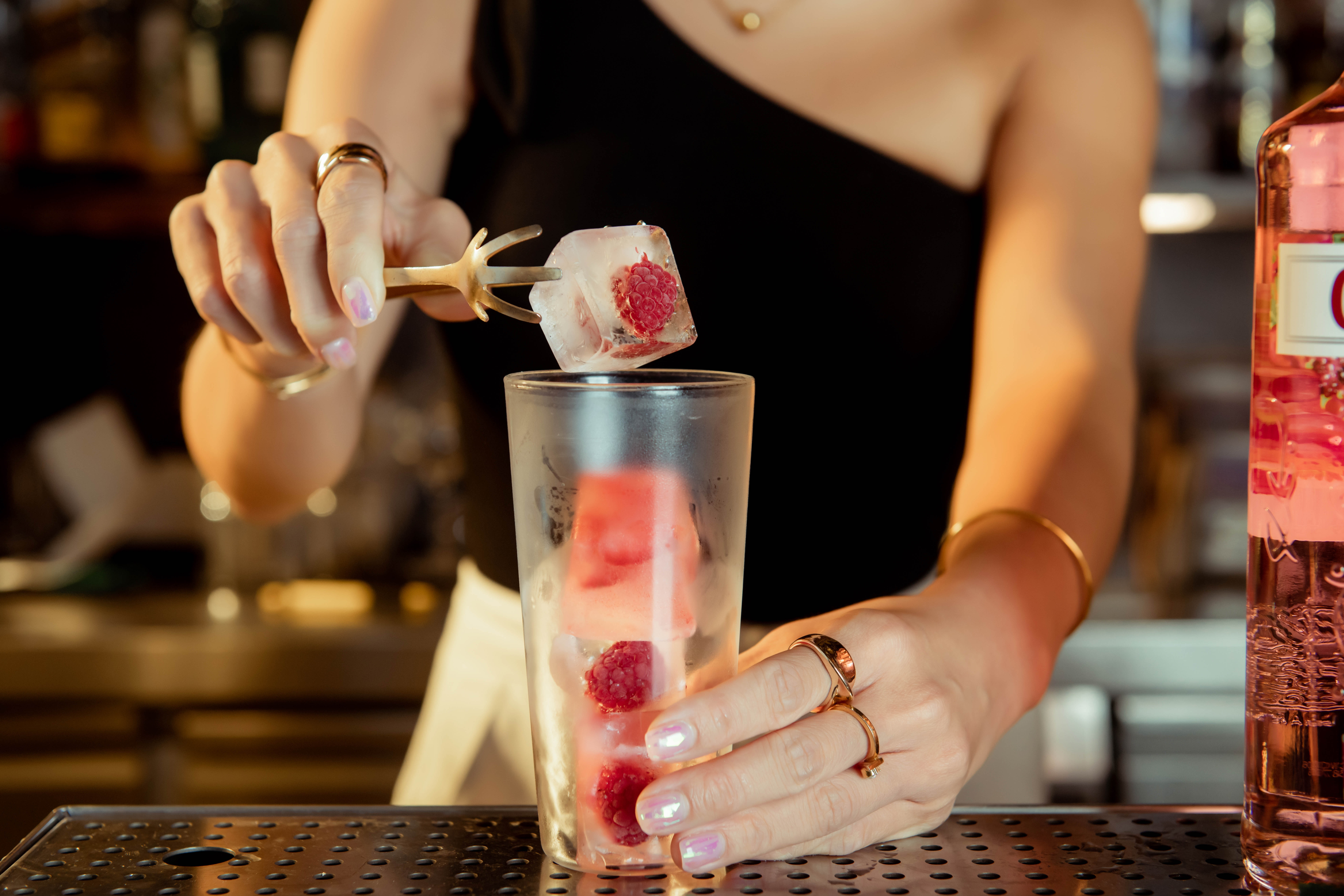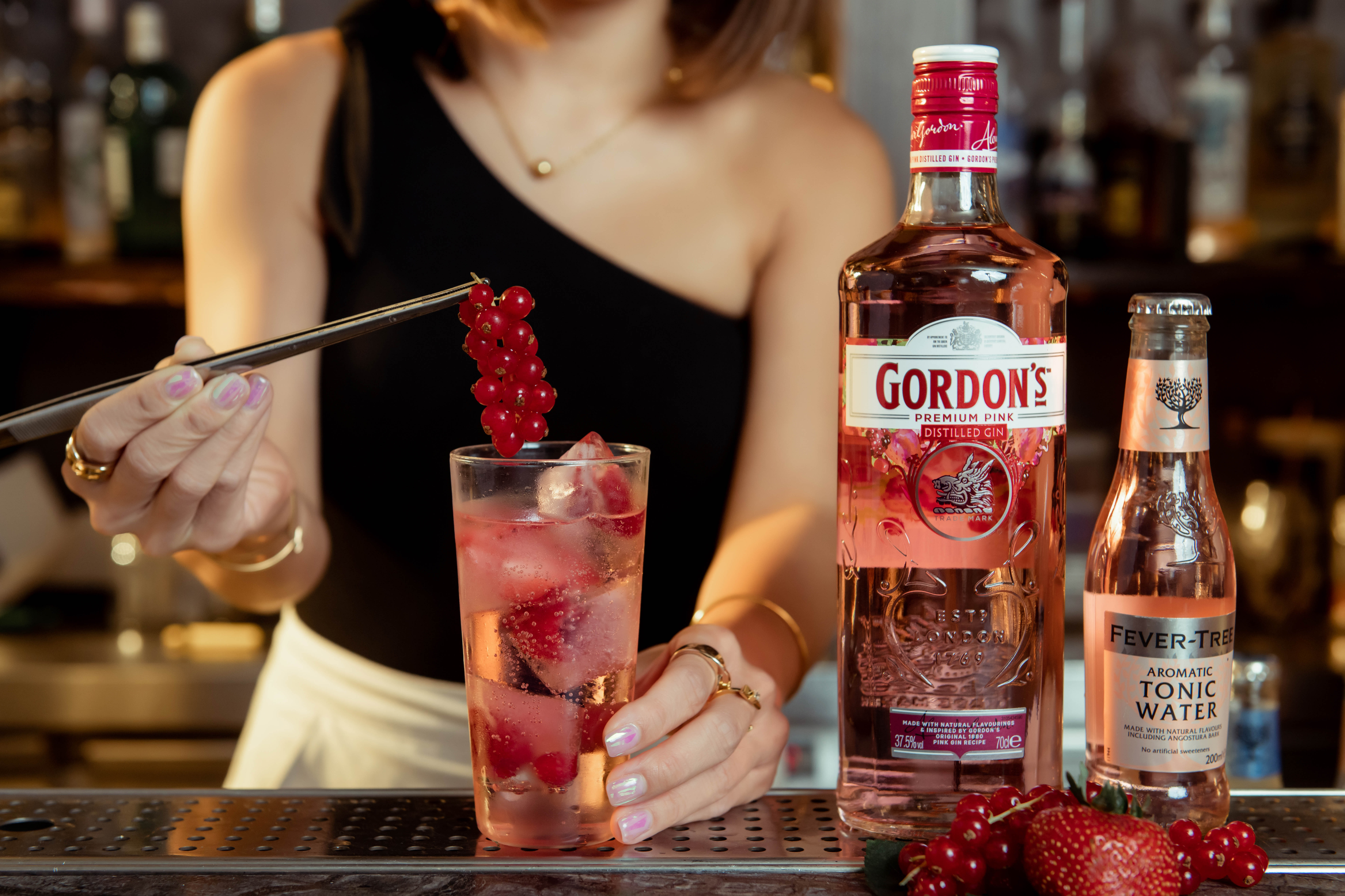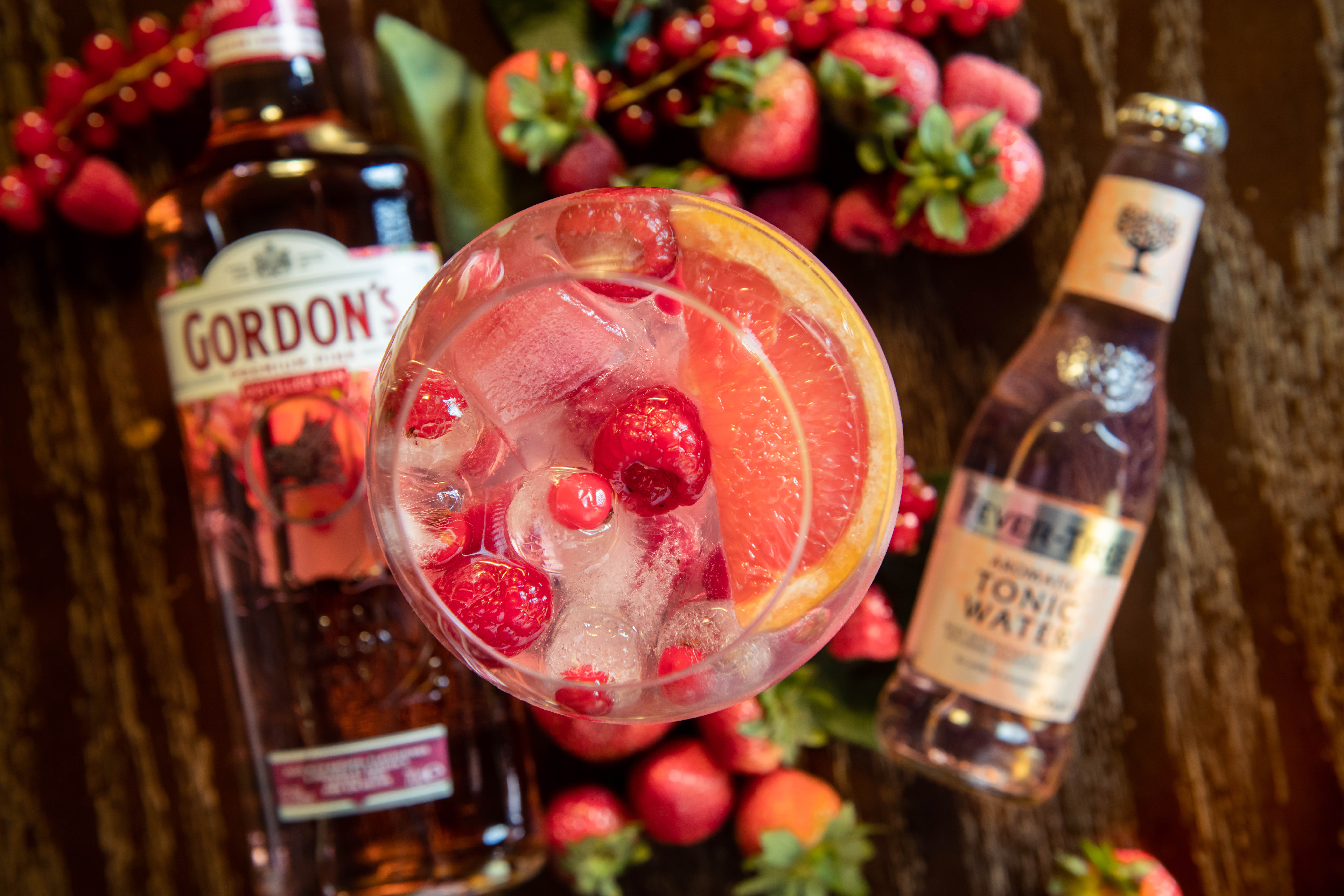準備所需材料:適量加入以紅樹莓、草莓和小紅果特製而成的冰塊、45ml Gordon's Pink Gin、FEVER-TREE Aromatic Tonic 或Sicilian Lemonade、你喜愛的裝飾。