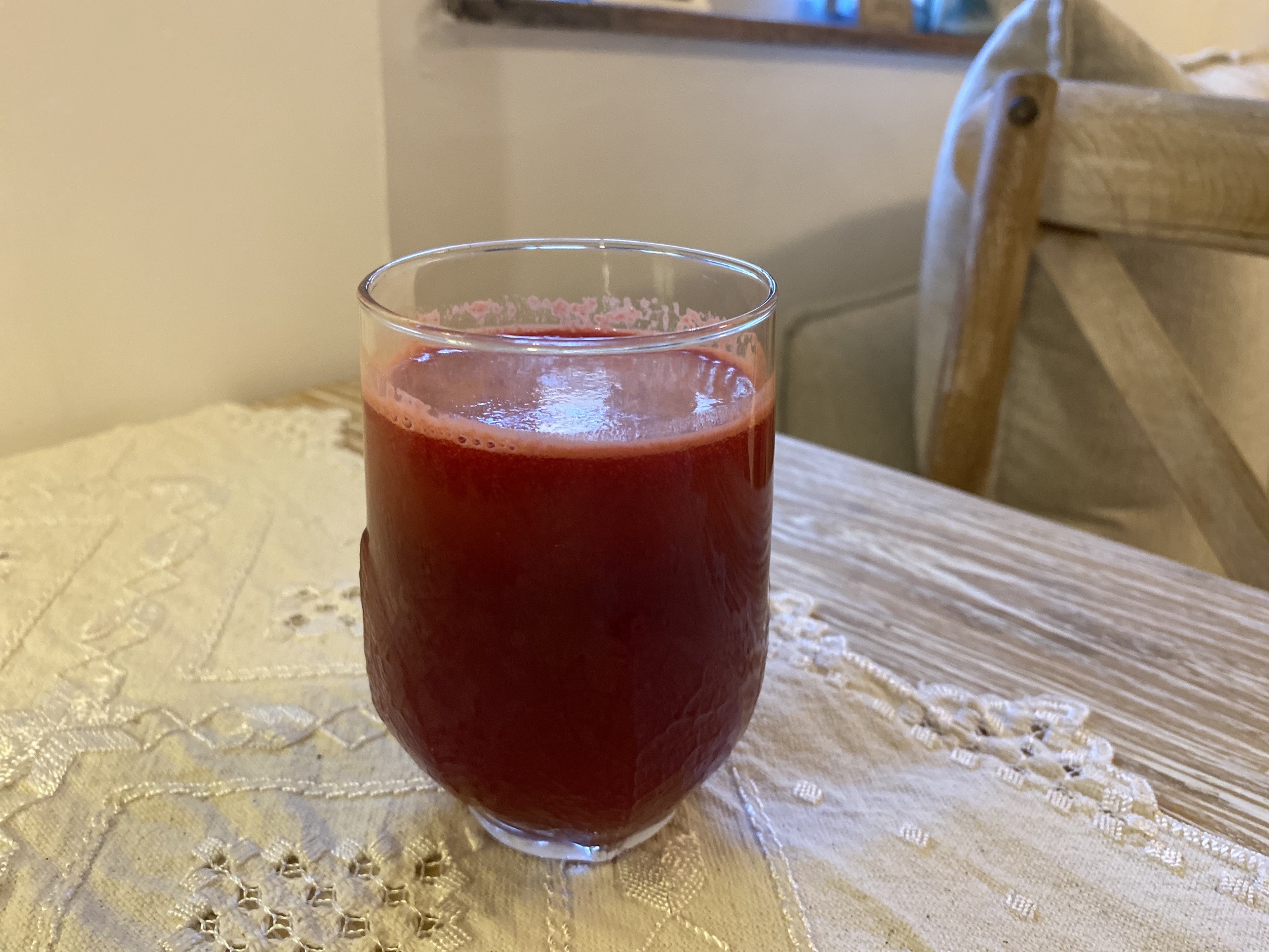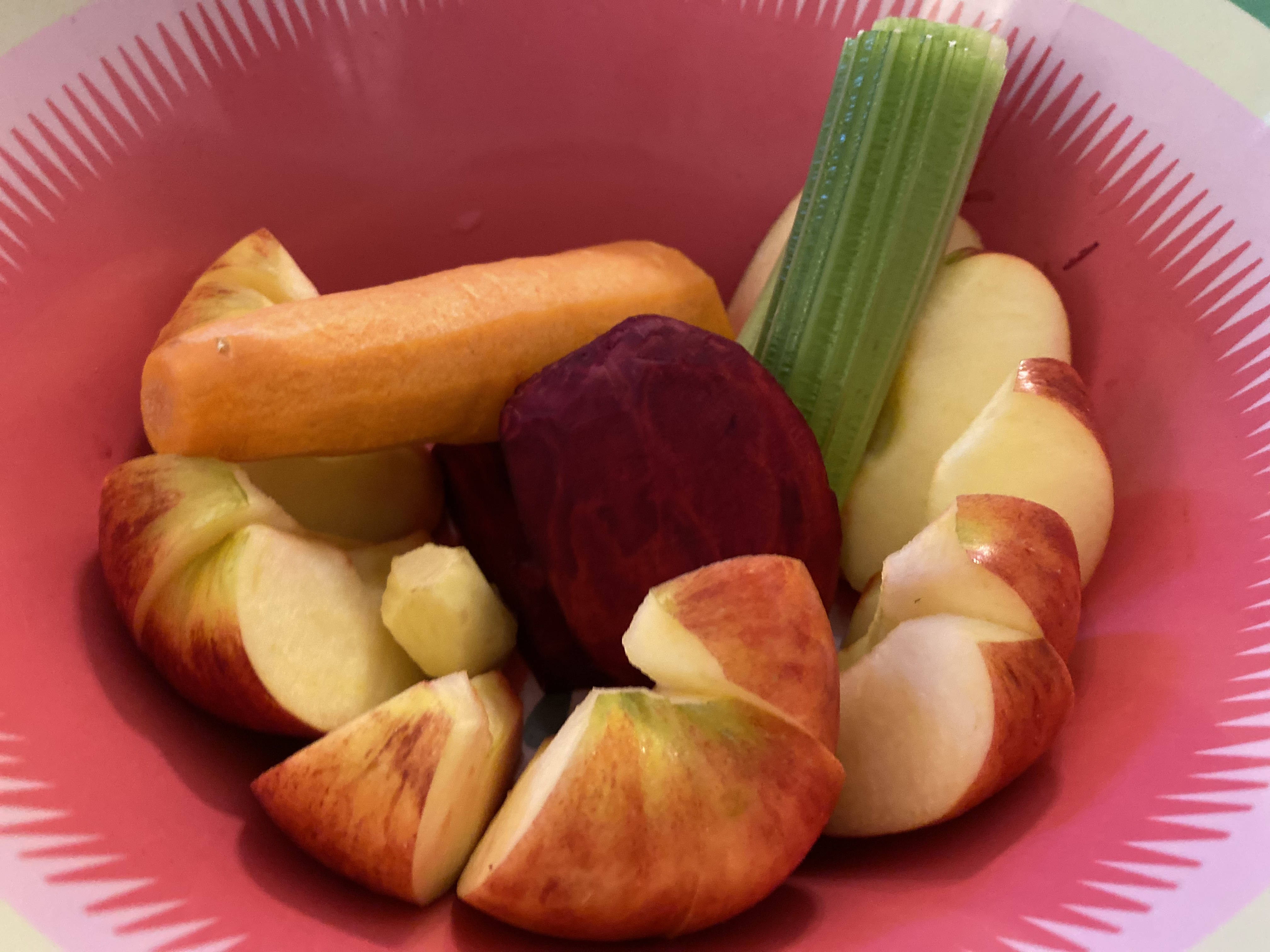 果汁由兩個蘋果、一個紅菜頭、一條紅蘿蔔、一小塊薑、一條西芹鮮榨而成,有助排肝毒。
