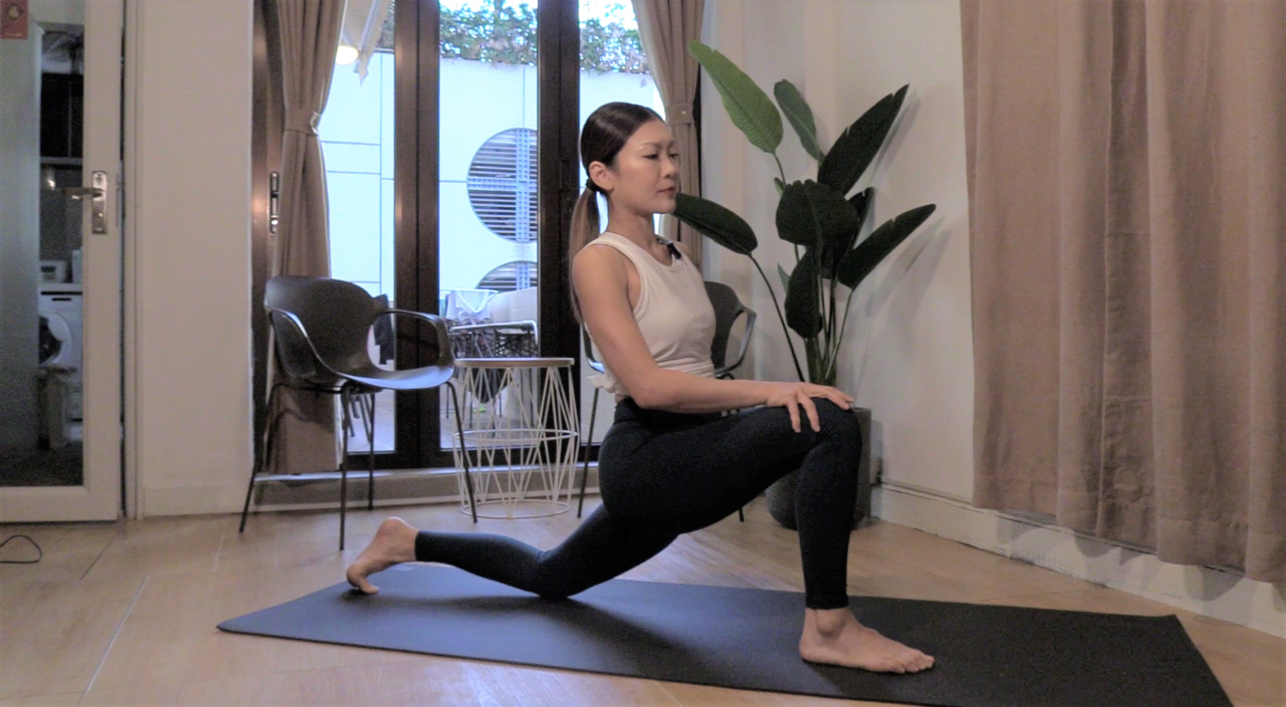 做法:呈跪姿狀,一隻腳跨向前,約兩呎半至三呎半的距離,膝蓋與腳踭成一直線,雙手放在大腿上,收緊臀部肌肉,注意背部挺直,保持3至5個呼吸,然後換邊進行,重複5組。